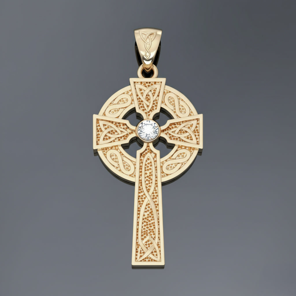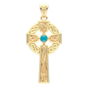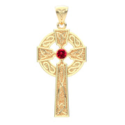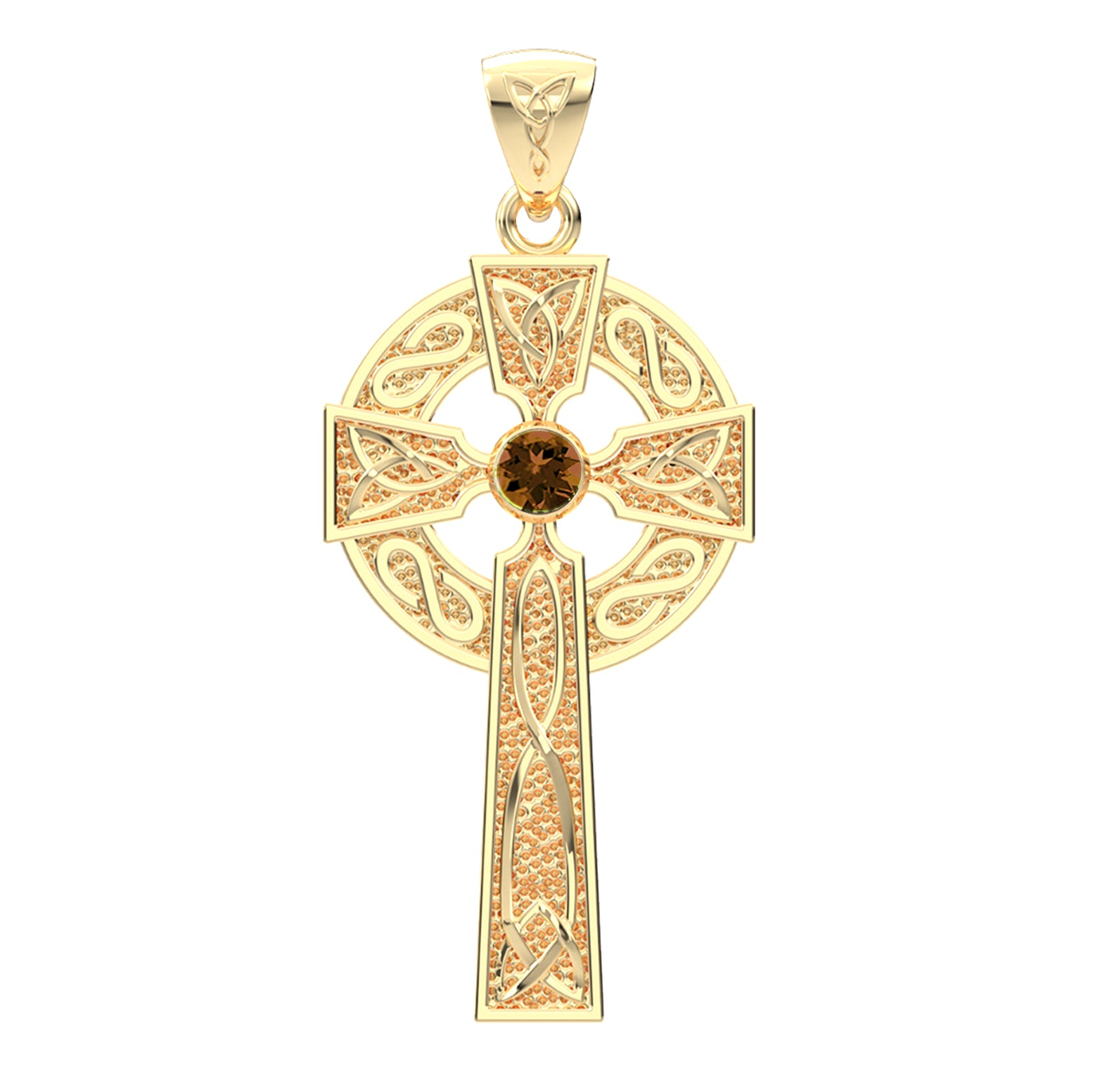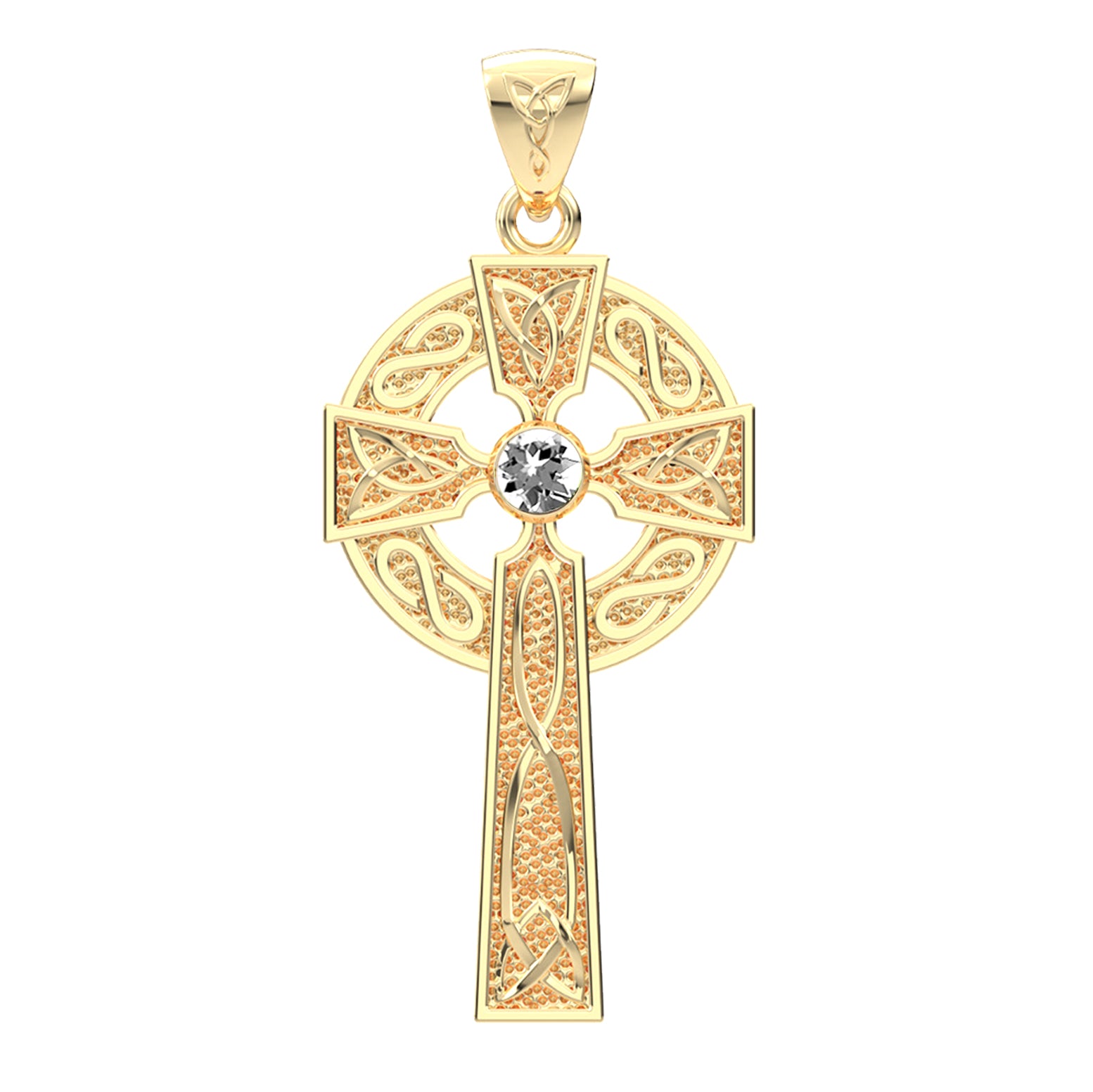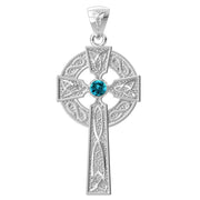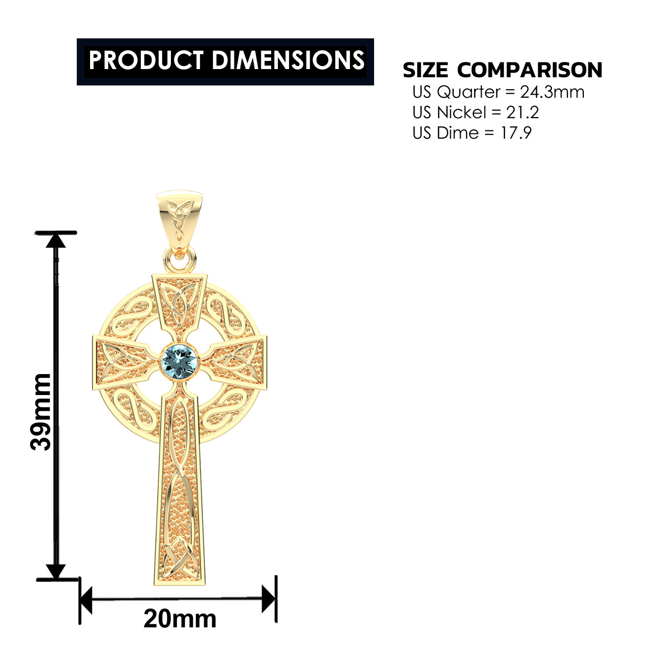 Handcrafted from solid 10k or 14k yellow or white gold, this pendant features a center birthstone, a nimbus, trinity knots, solid construction, and a polished finish. The iconic Celtic cross is a traditional symbol of faith and spirituality showcasing the beauty of Celtic craftsmanship.