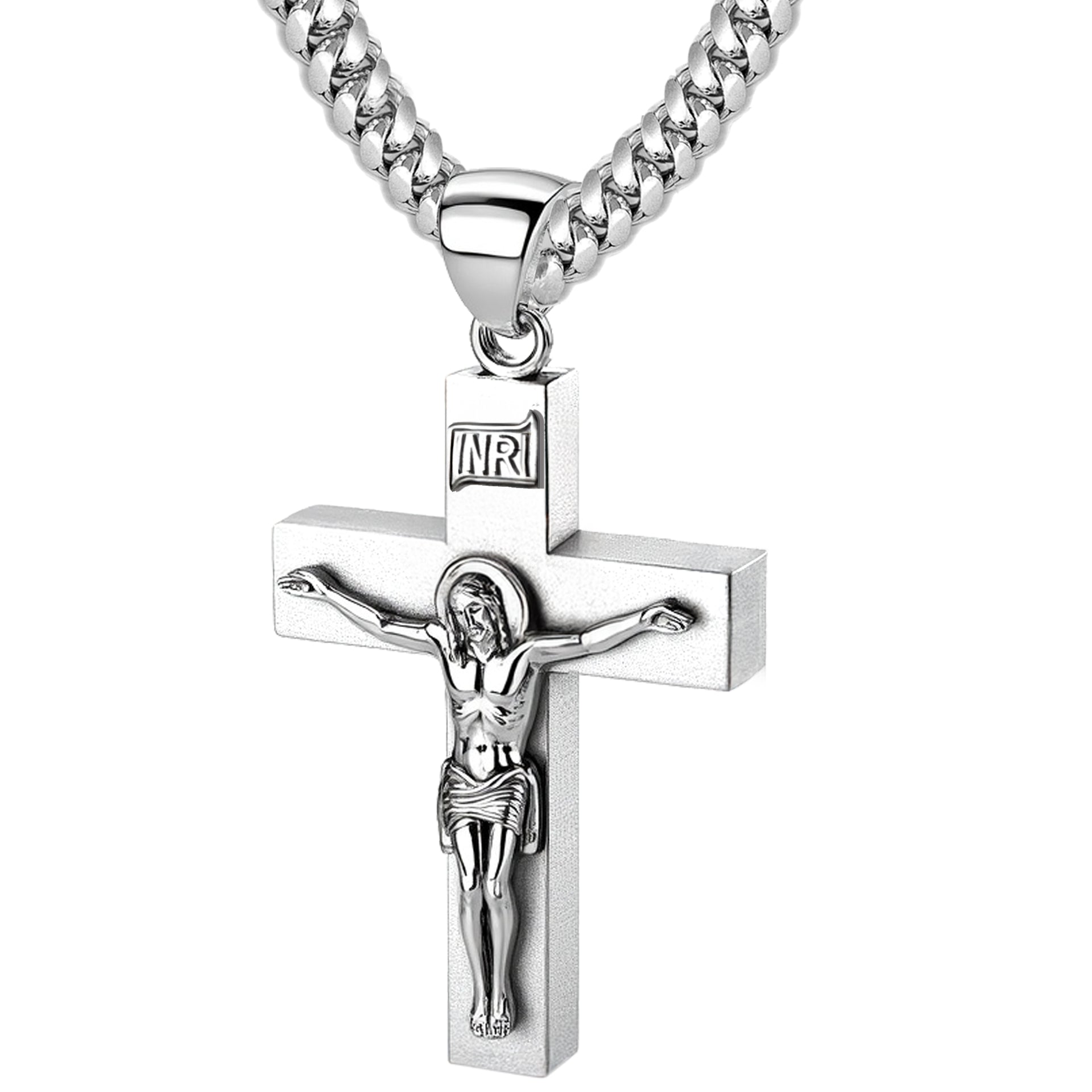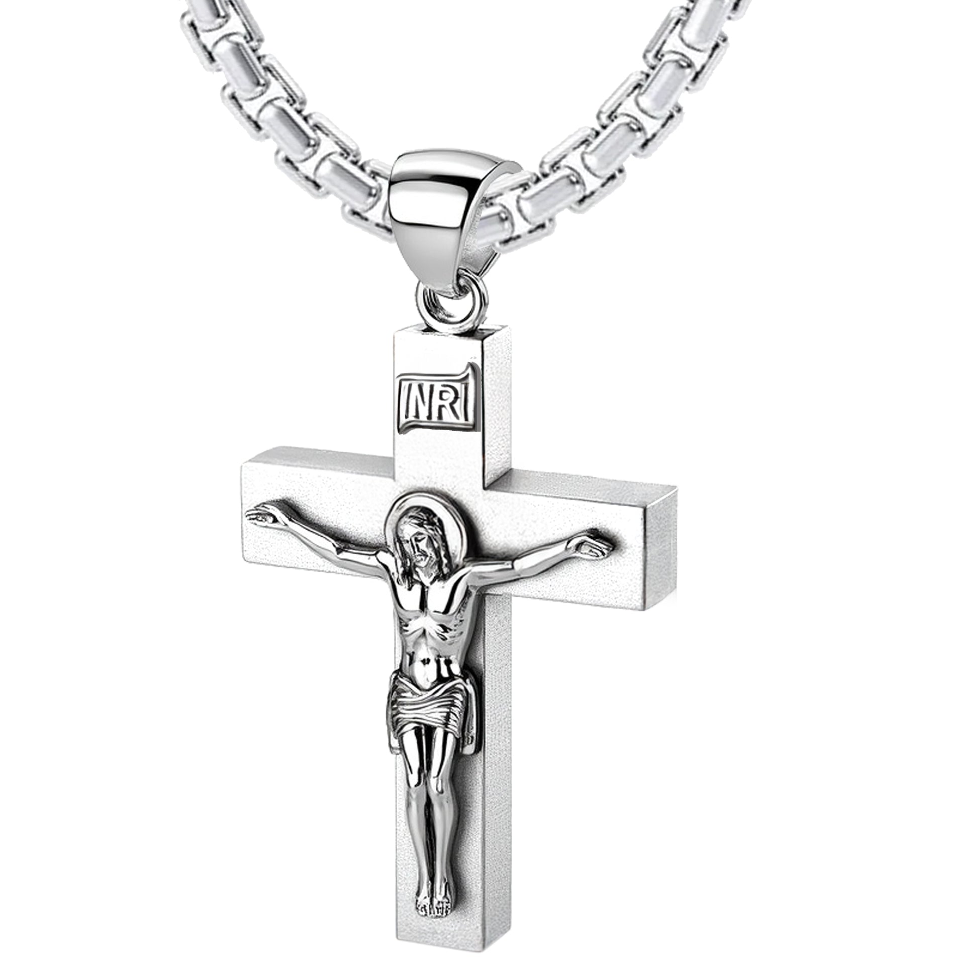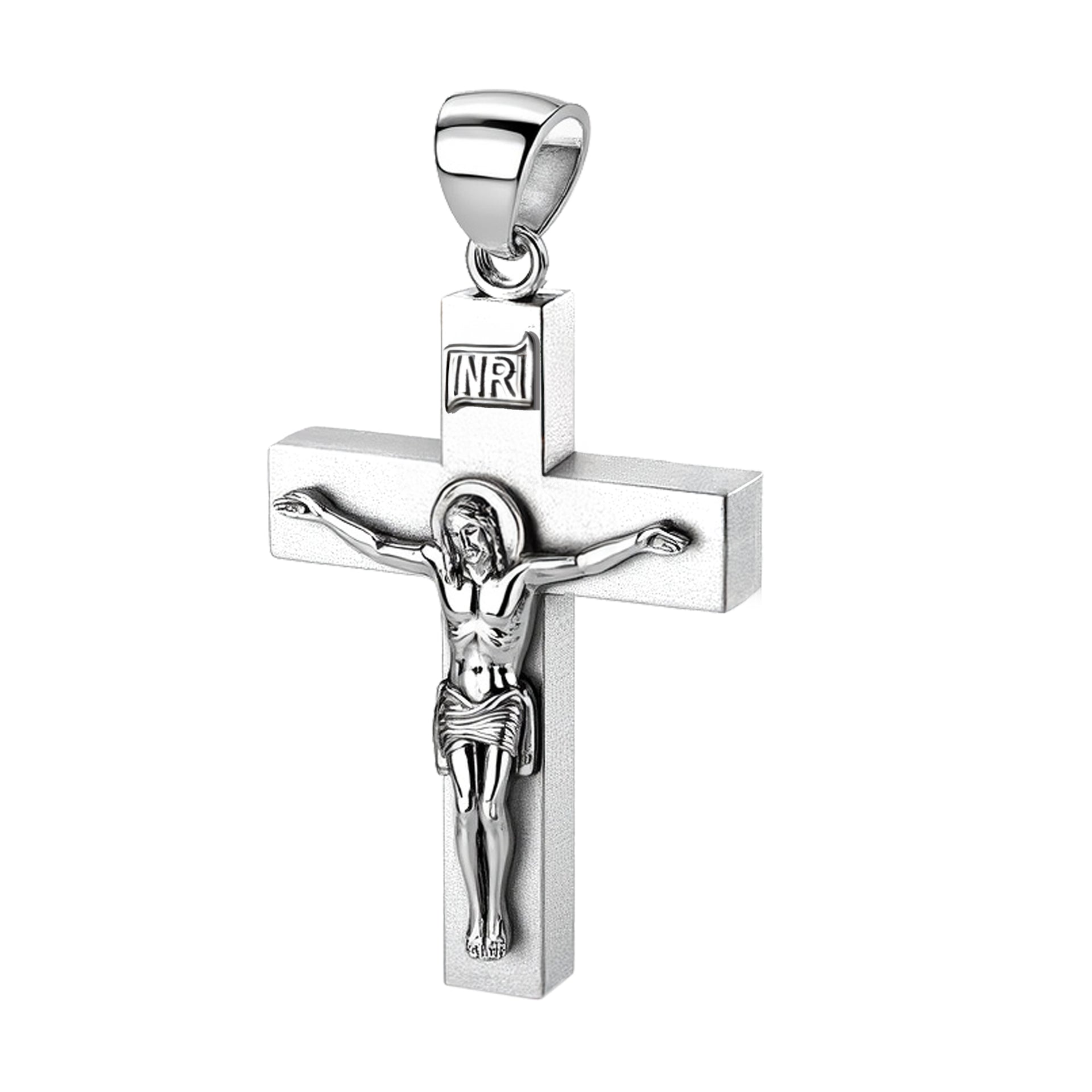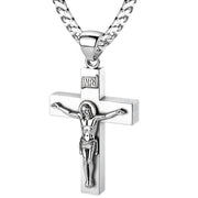 Proudly display your faith with our collection of religious jewelry. Handcrafted from 925 sterling silver, this crucifix cross pendant features a bright white satin finish, a 6mm x 4mm box design, solid construction, a larger bail to accommodate chains up to 6mm and highly polished finish accents. Wearing a cross pendant provides comfort and protection. It is a constant reminder of God's love and illustrates your commitment to Jesus Christ.