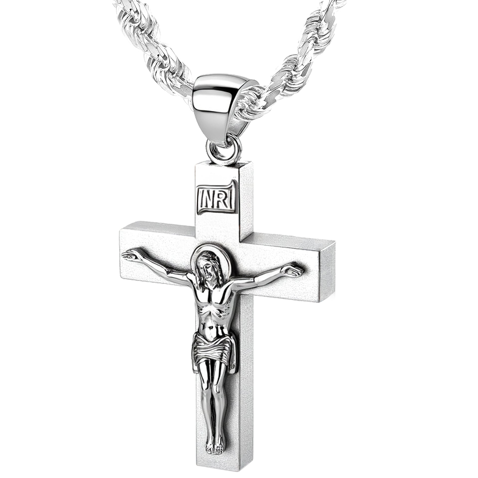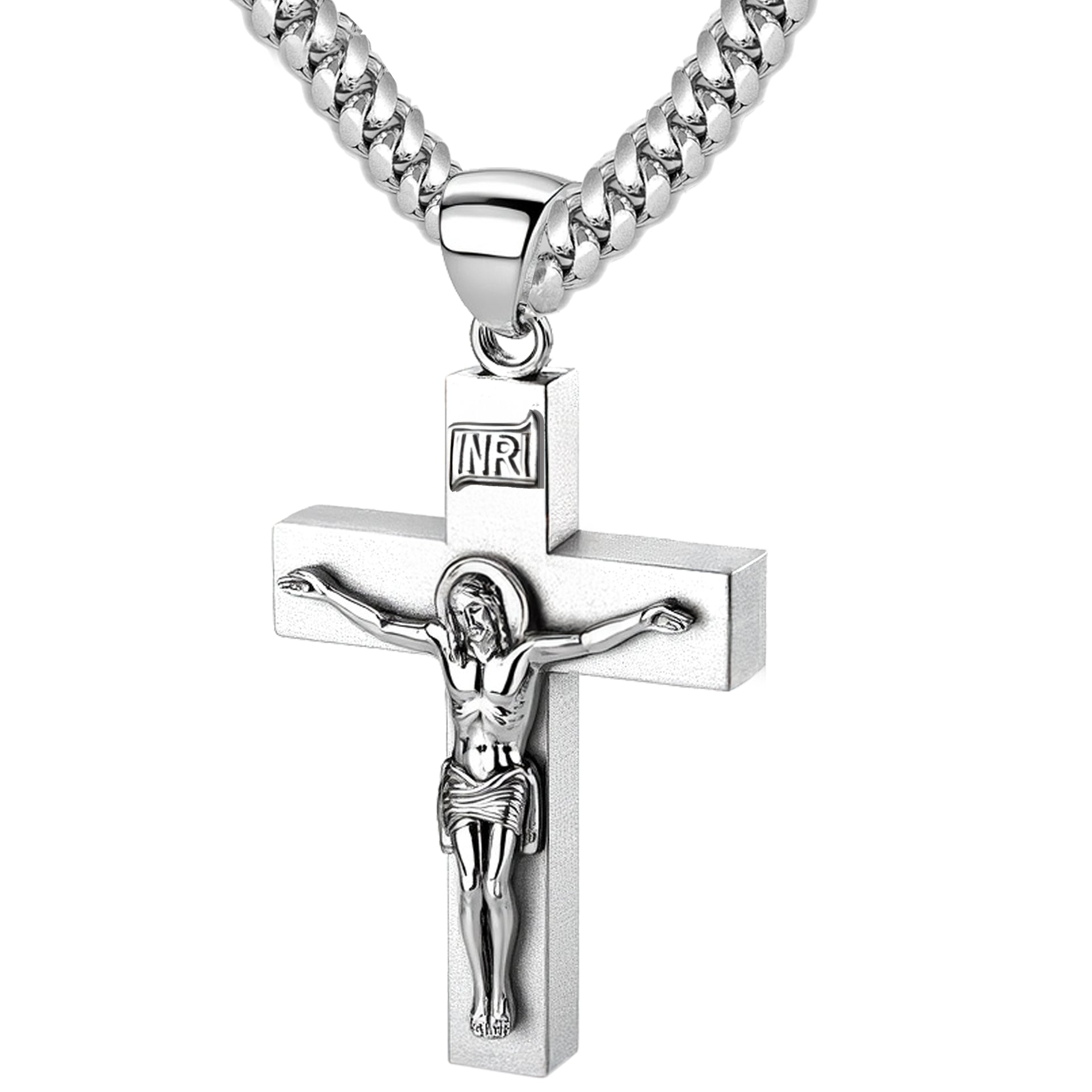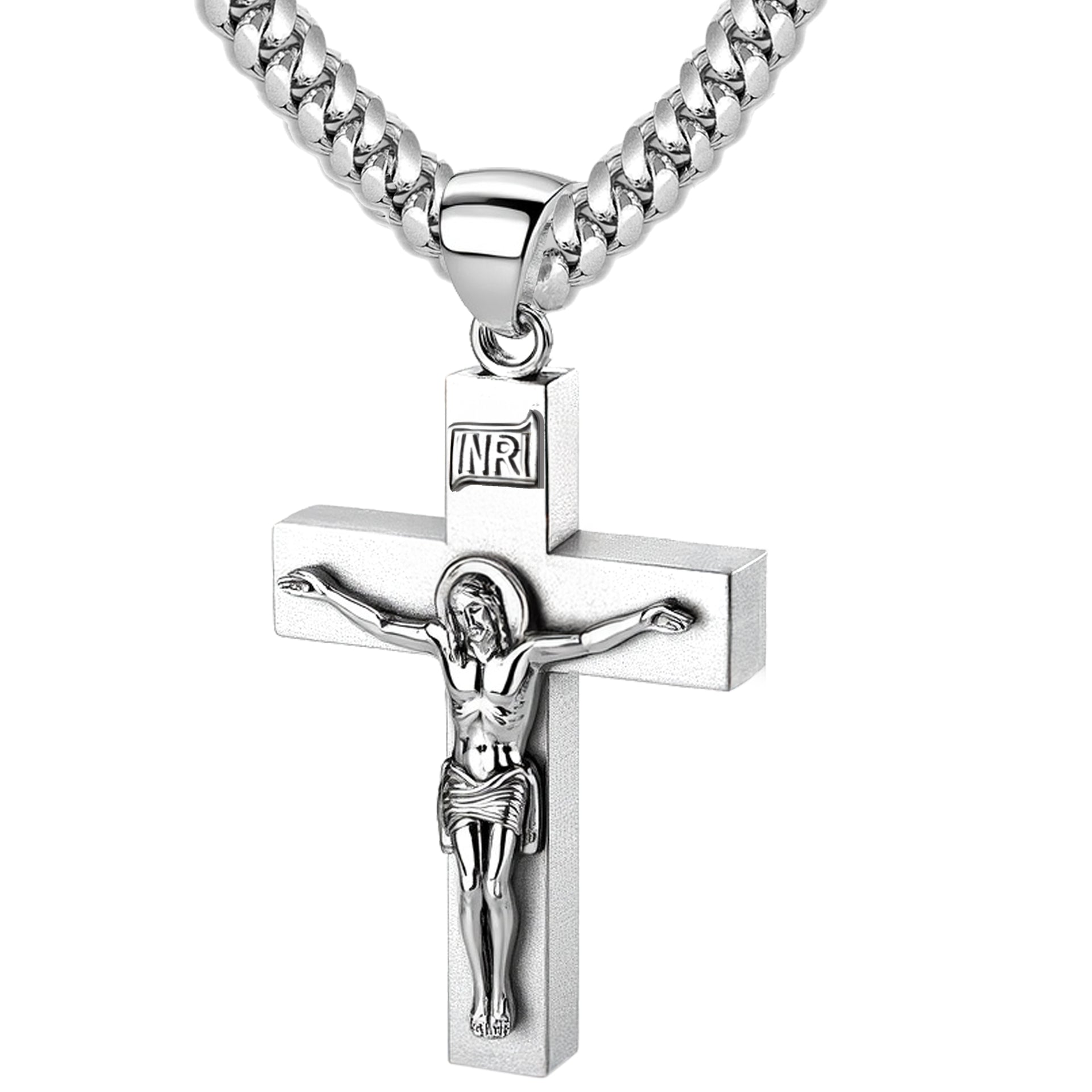 Proudly display your faith with our collection of religious jewelry. Handcrafted from 925 sterling silver, this crucifix cross pendant features a bright white satin finish, a 6mm x 4mm box design, solid construction, a larger bail to accommodate chains up to 6mm and highly polished finish accents. Wearing a cross pendant provides comfort and protection. It is a constant reminder of God's love and illustrates your commitment to Jesus Christ.