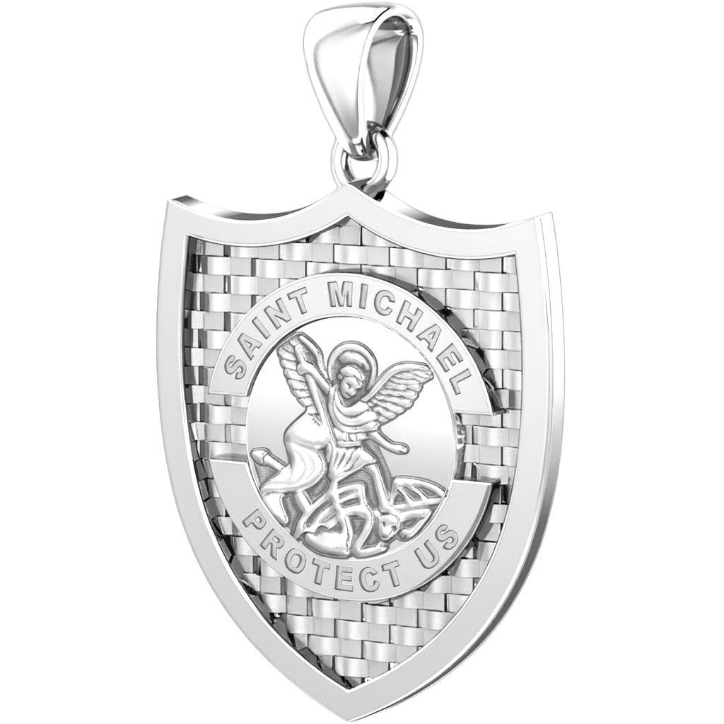 Come try our newly designed 14K yellow gold Saint Michael shield pendant. This pendant features an embossed figurine of St. Michael slaying Satan, a shield or badge shape, and a detailed weave pattern background. All of our new saint medals are designed to last multiple lifetimes. They are solid, heavy & highly detailed. Saint Michael is the legendary patron saint of travelers, invoked as protection against danger, storms, and plagues.