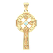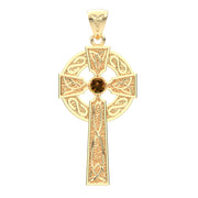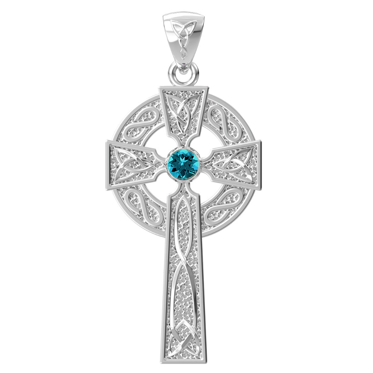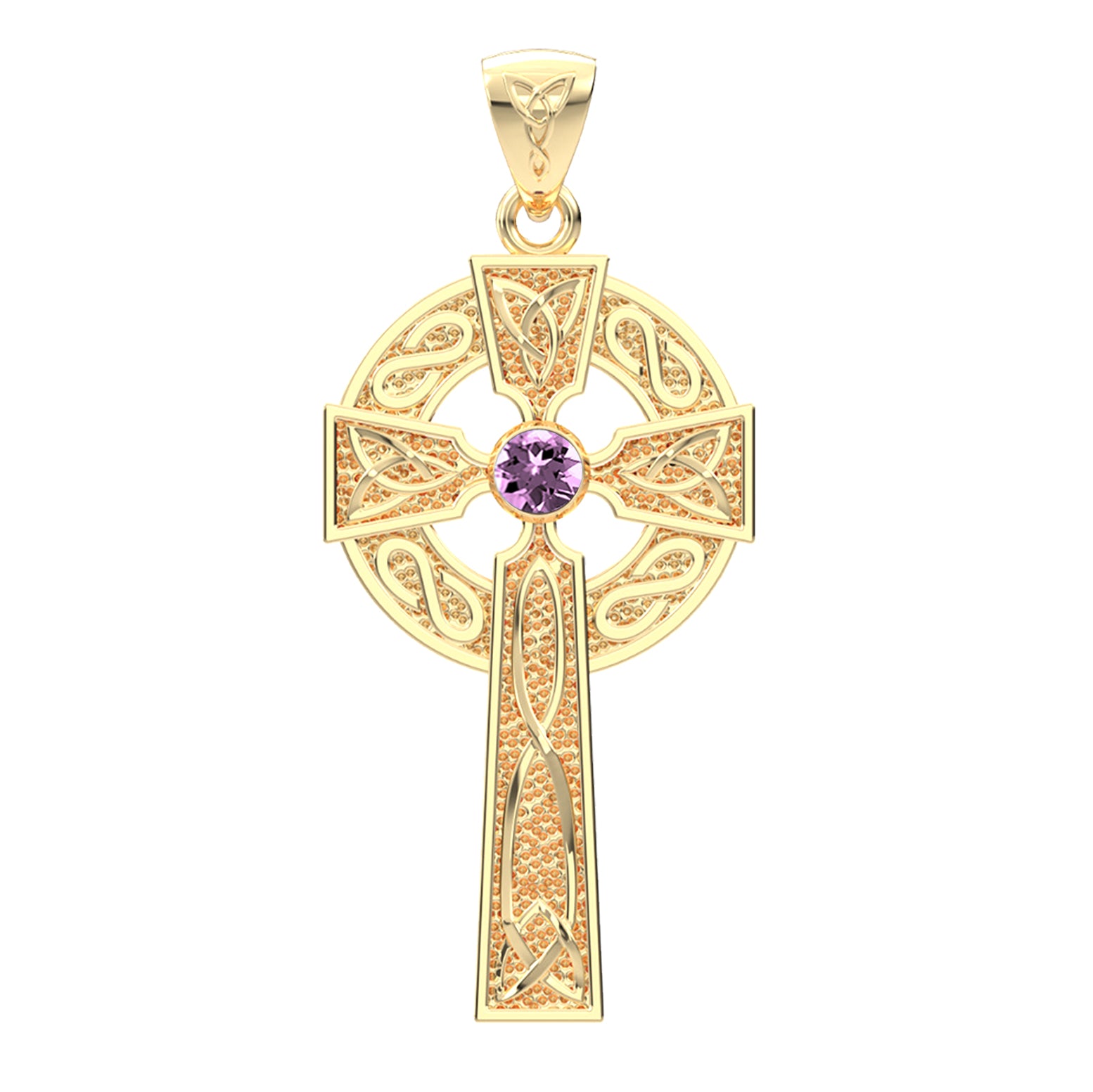 Handcrafted from solid 10k or 14k yellow or white gold, this pendant features a center birthstone, a nimbus, trinity knots, solid construction, and a polished finish. The iconic Celtic cross is a traditional symbol of faith and spirituality showcasing the beauty of Celtic craftsmanship.