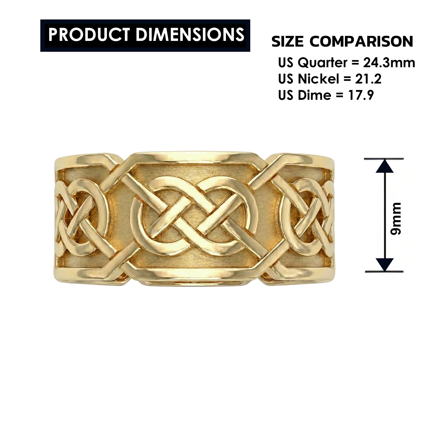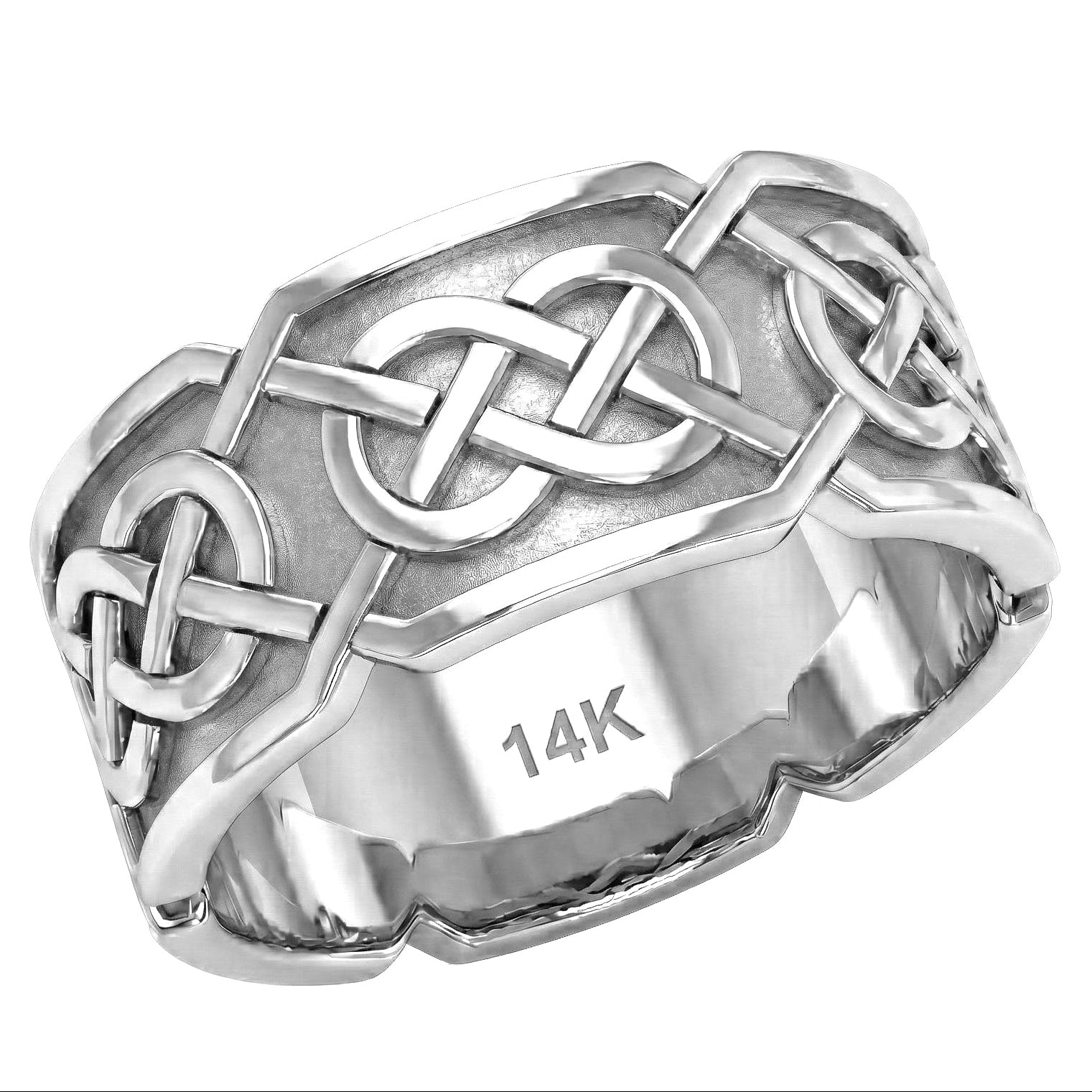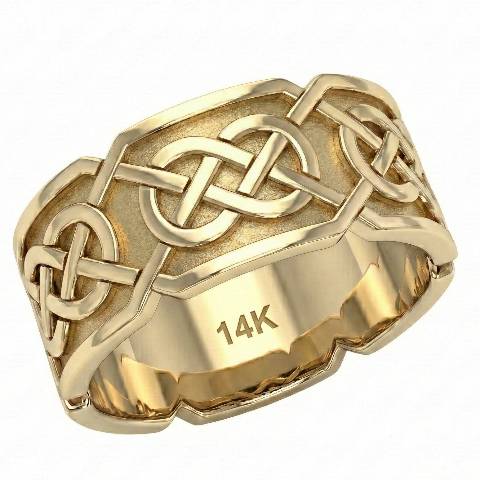 Up for sale is a brand new men's 10mm Irish Celtic endless or love knot band ring in 10K or 14K yellow or white gold. The Celtic endless knot is characterized by no beginning or end and represents eternity. It has been incorporated into art for millennia and has become distinctly recognizable for its classic look and appearance.