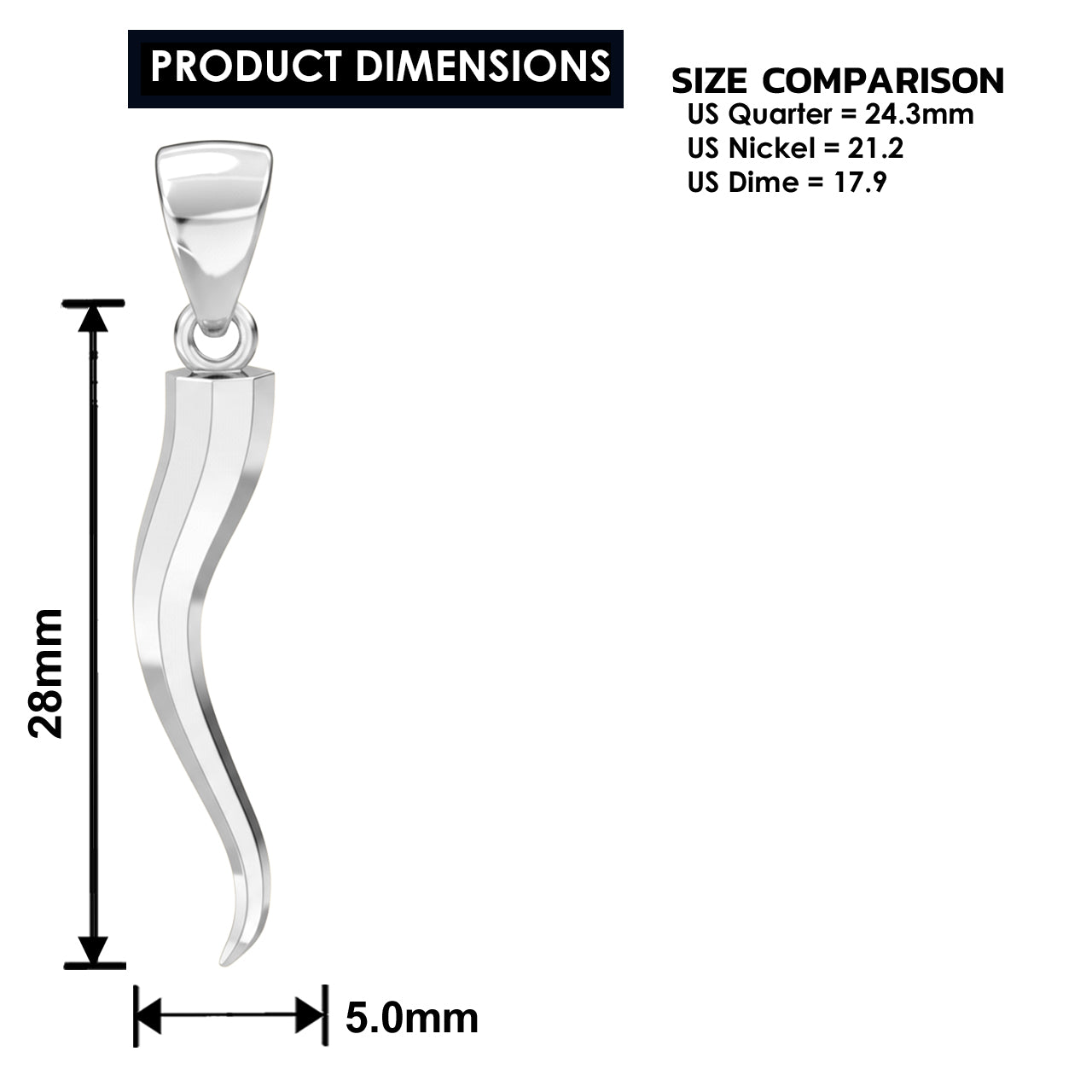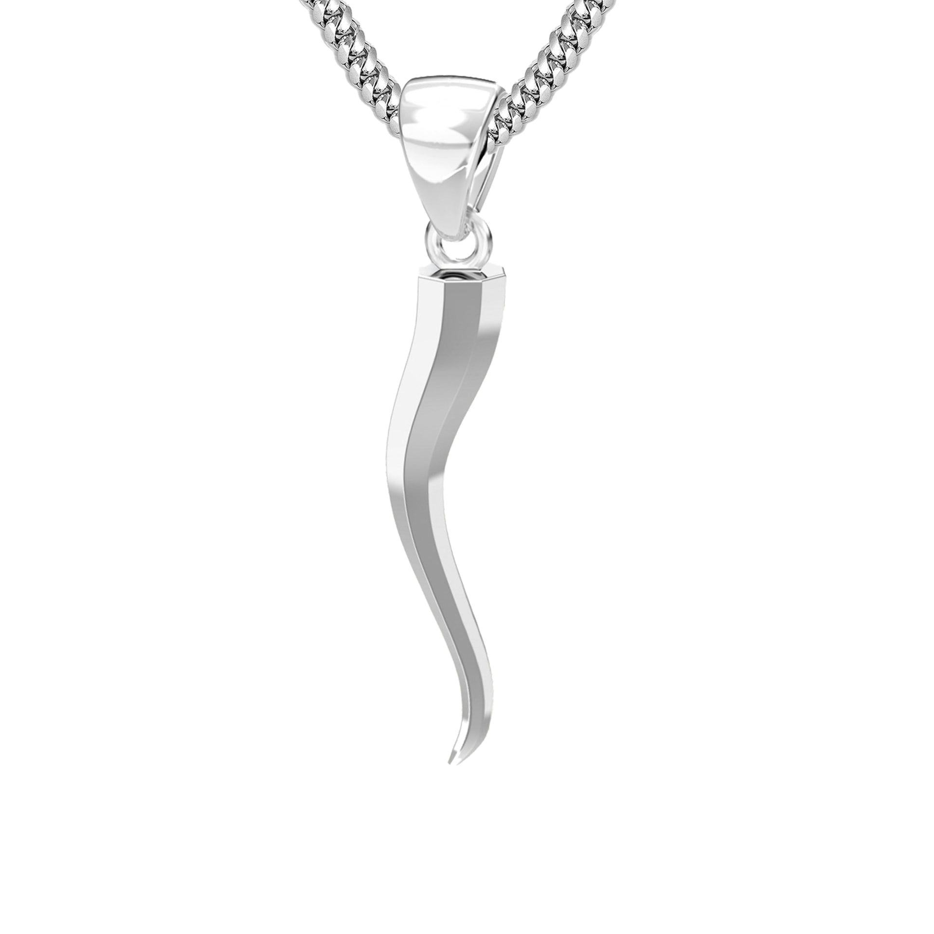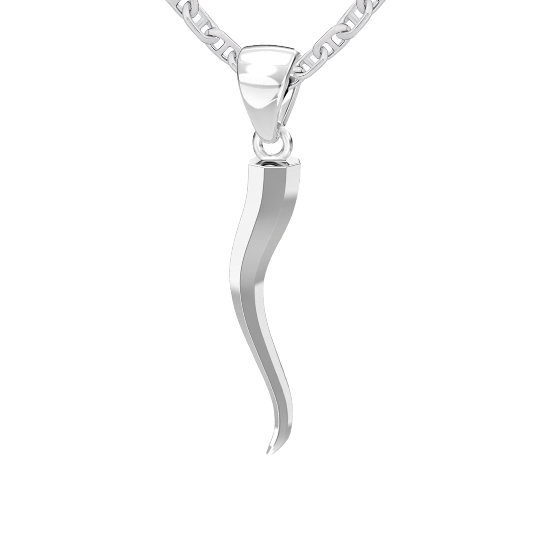 This octagon shaped Italian horn or cornicello amulet is worn for protection against evil spirits or curses. It is popular in the USA with descendants of Italian immigrants and by the general public as a fashion statement alike. Unlike other manufacturers, our Italian horn pendant is solid sterling silver, not hollow.