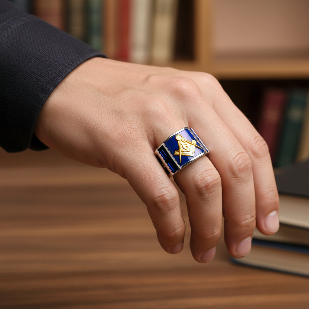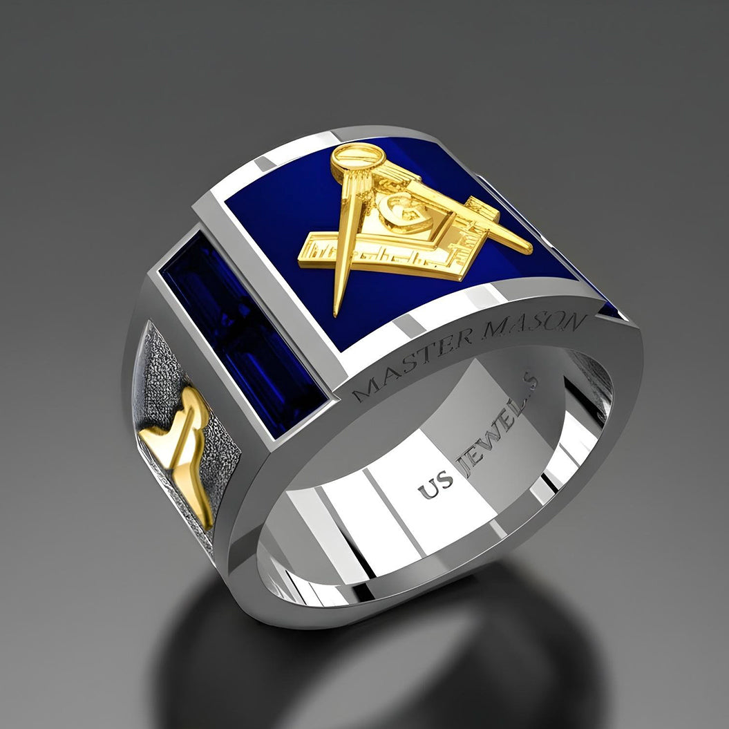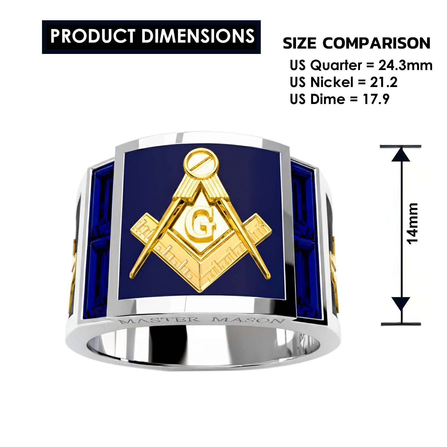 Men's 925 Sterling Silver & 10k or 14k Lab Created Blue Sapphire and Lapis Master Mason Masonic Ring