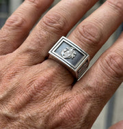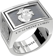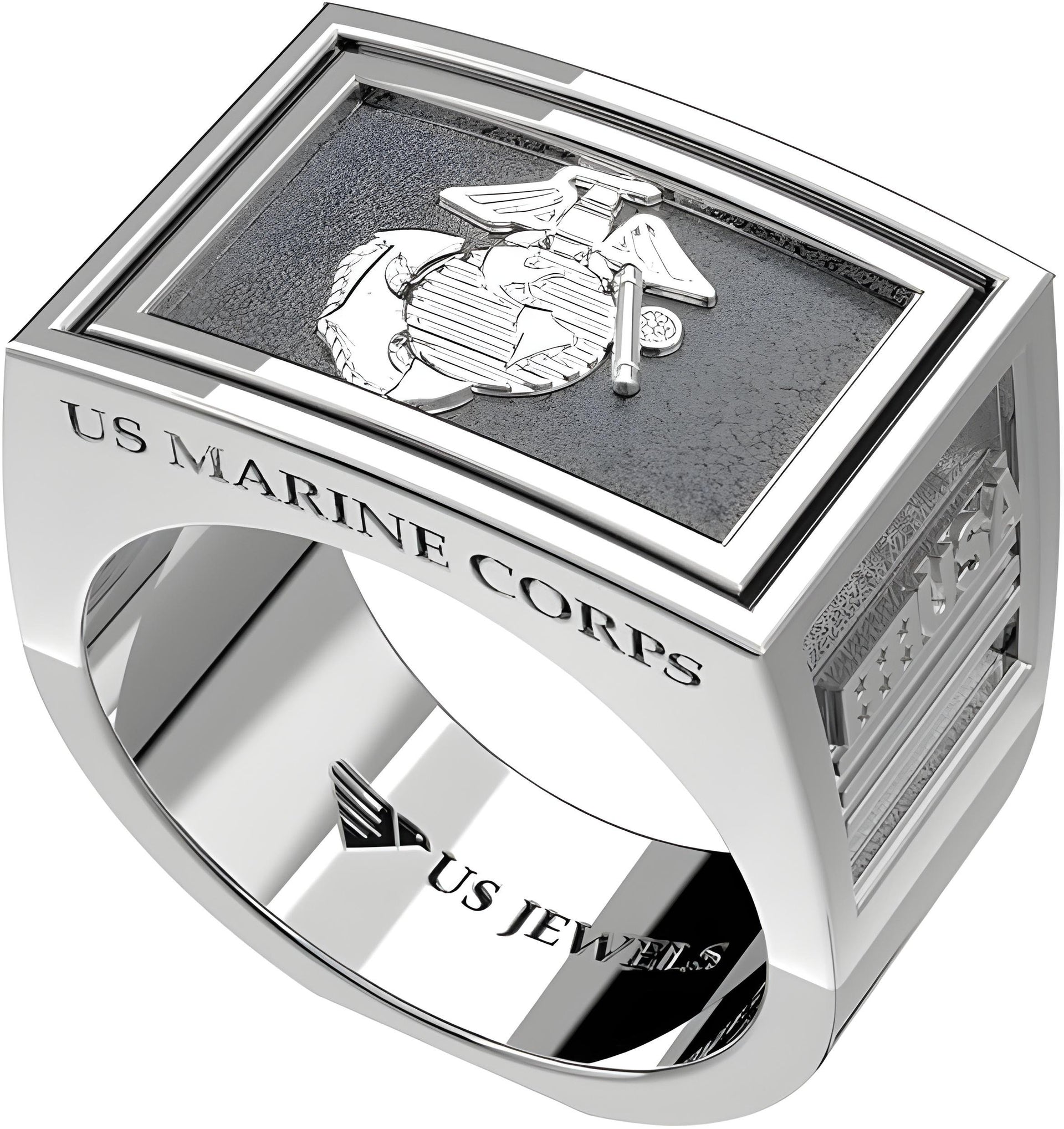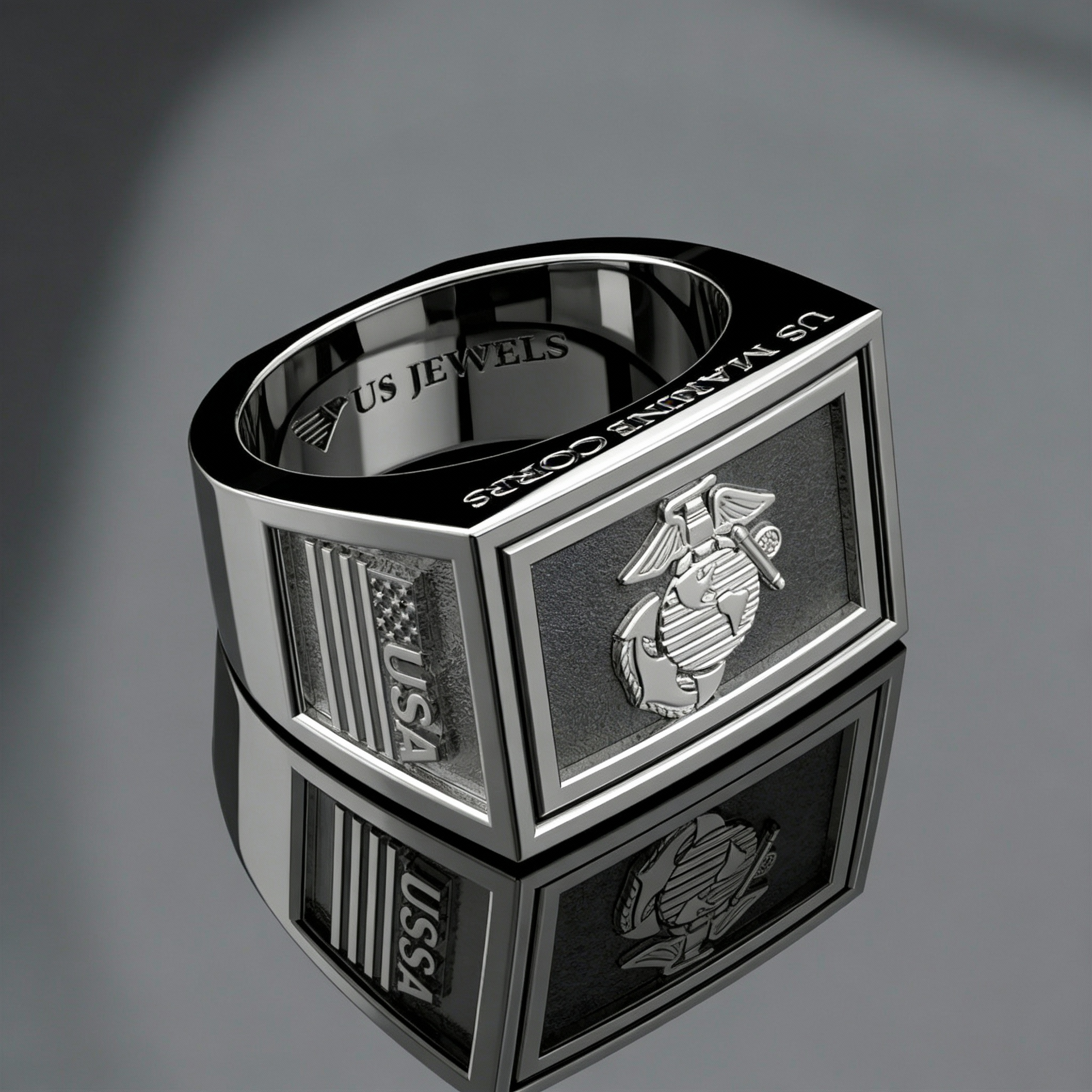The Solid 925 Sterling Silver Marine Corps Ring is an impressive piece of jewelry designed to honor those who serve or have served in the United States Marine Corps. This beautifully crafted ring features embossed emblems and is made from heavy solid 925 sterling silver with a 16mm top width and an 8 mm bottom width. It's sure to last through rough use and be a lasting reminder of your pride. Every ring is hallmarked 925, 10k or 14k and 5% of all sales go directly to our military.