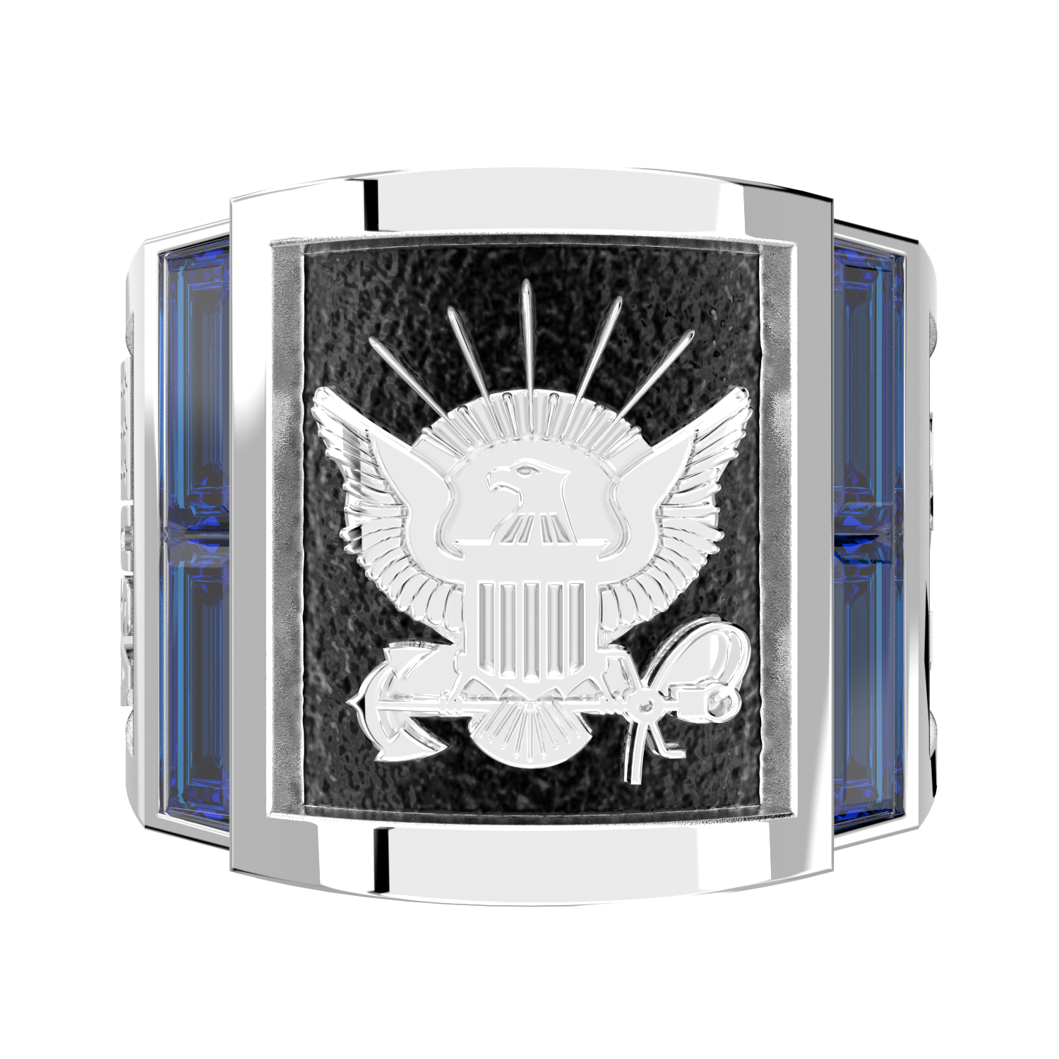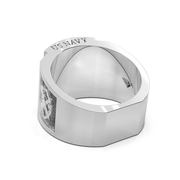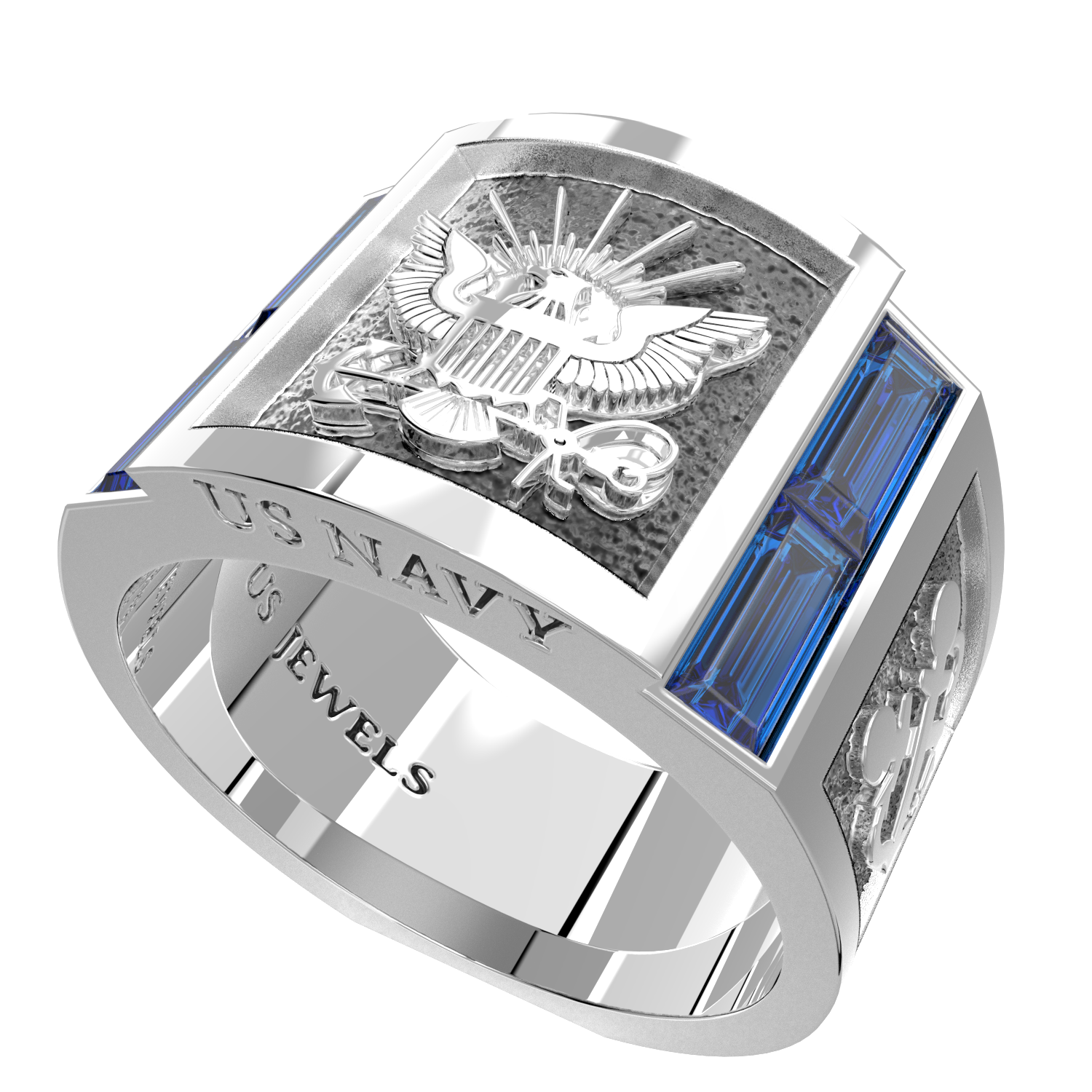 The Solid 925 Sterling Silver US Navy Ring with synthetic sapphires is a timeless piece of jewelry that honors the service and sacrifice of all those who serve in the US Military. This ring features solid back design, deep casted details, 3D embossed graphics, and a flat bottom making it extremely comfortable to wear. It is officially licensed by the US Navy for its authenticity.