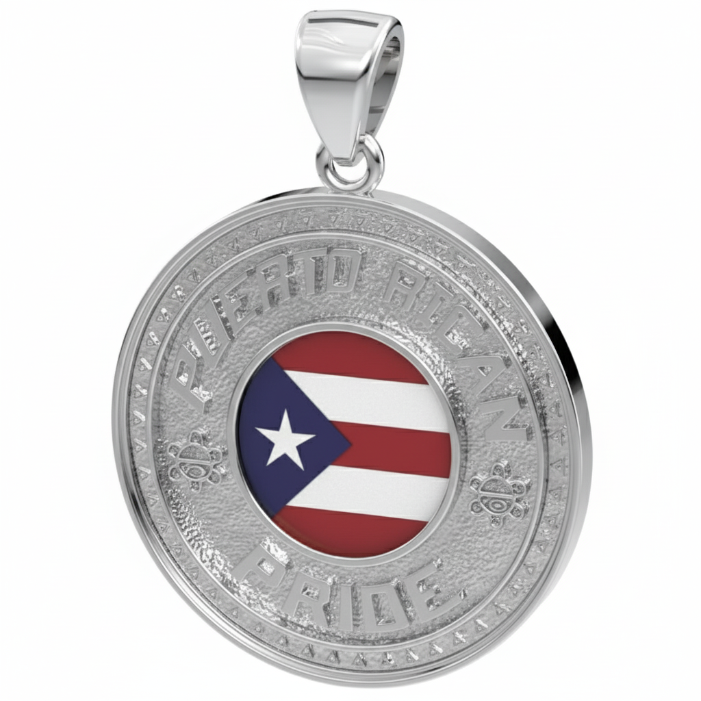 Proudly display your Puerto Rican heritage with our new pride medal collection. Beautifully crafted in solid 14K Yellow Gold, it features a heavily embossed lettering in a cultural font, Taino Sun God Boricua and Puerto Rican flag at the center.
