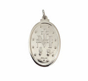 Handcrafted from 925 sterling silver, this Miraculous Medallion pendant features an embossed figurine of Mother Mary, die-stamped lettering, and a highly polished finish. In 1830 Mary spoke to St. Catherine and showed her the vision of the now-famous medal. On the front, this pendant features Mary standing on a globe with streaming light surrounding her with the words "O Mary, conceived without sin, pray for us who have recourse to thee." On the backside, twelve stars surround a large "M" and cross. Below the "M" there are two flaming hearts. The left heart, circled with thorns, represents Jesus, and the right heart, pierced by a sword, symbolizes Mary.