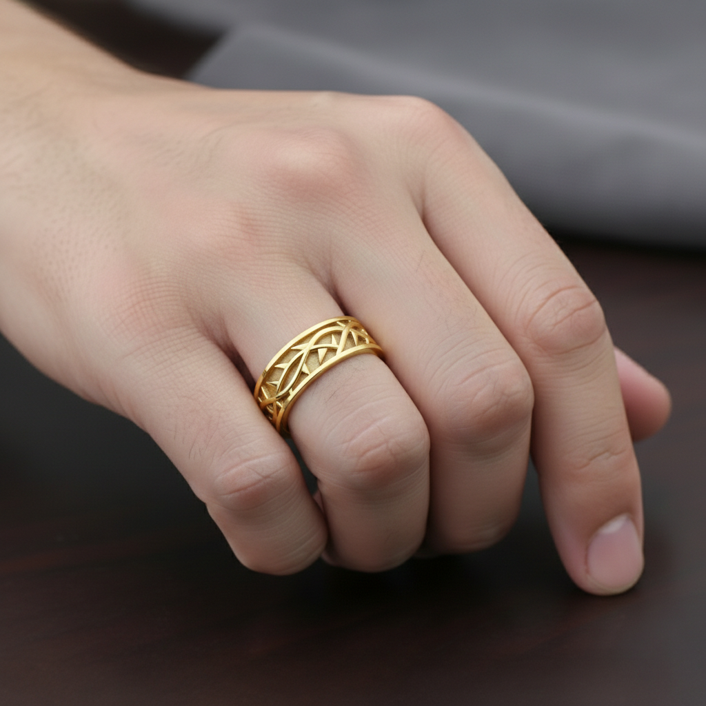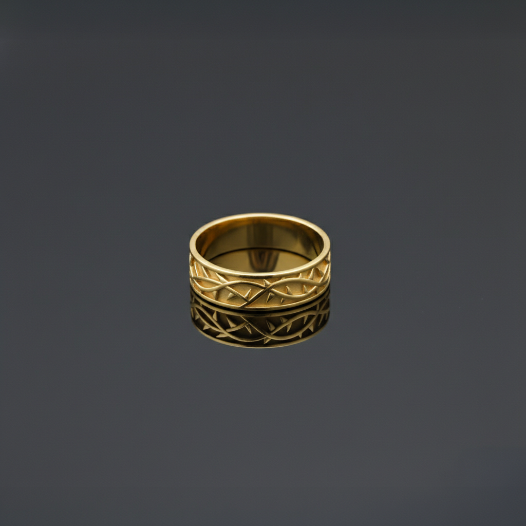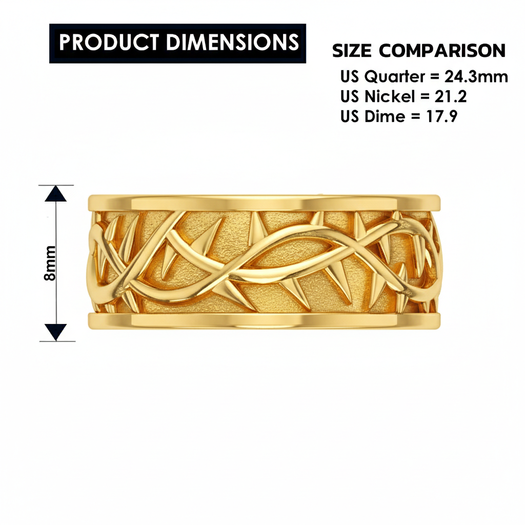 Display your faith with our new men's 8mm Crown of Thorns ring, available in 10k or 14k gold. Each piece is meticulously handcrafted with a high polished thorn pattern that captures intricate detail and reflects light beautifully. The Crown of Thorns symbolizes the suffering of our Lord, Jesus Christ, making this ring a meaningful expression of devotion for the faithful wearer. The substantial 8mm width provides a commanding presence on the hand while maintaining refined craftsmanship throughout. Whether you choose 10k gold for everyday durability or 14k gold for enhanced richness and luster, this ring serves as a powerful spiritual statement piece that honors your beliefs with timeless elegance.