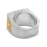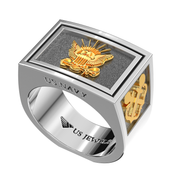 Show your pride with this stylish classic US Navy Statement Ring. Crafted from 925 sterling silver & 14k gold that is officially licensed by US military, this distinguished statement ring looks great in any situation. The top of the ring is 16mm wide and it tapers down to 8mm at its bottom. This unique ring offers a powerful statement and it makes a great gift for any Navy solider, veteran or patriot!