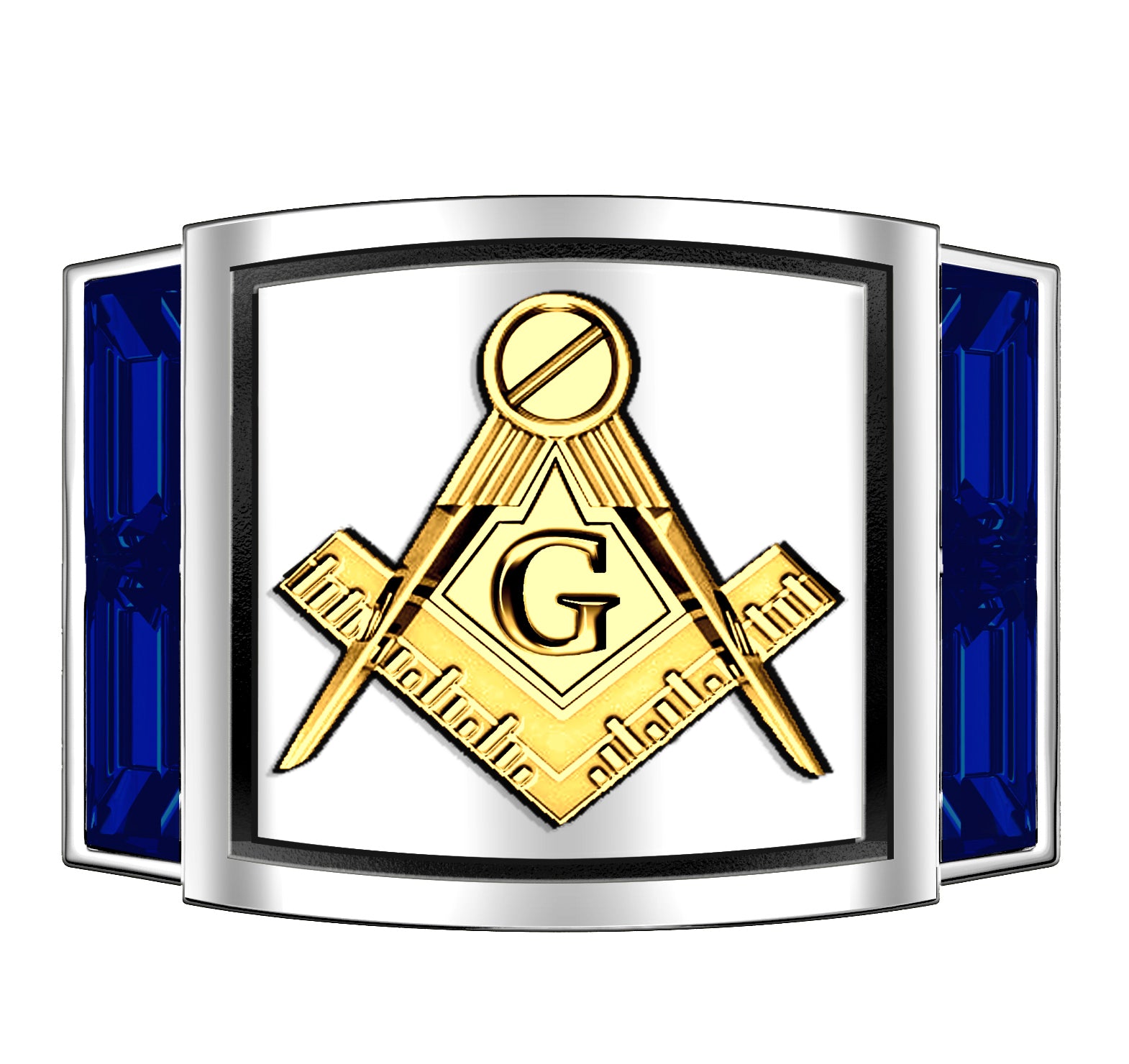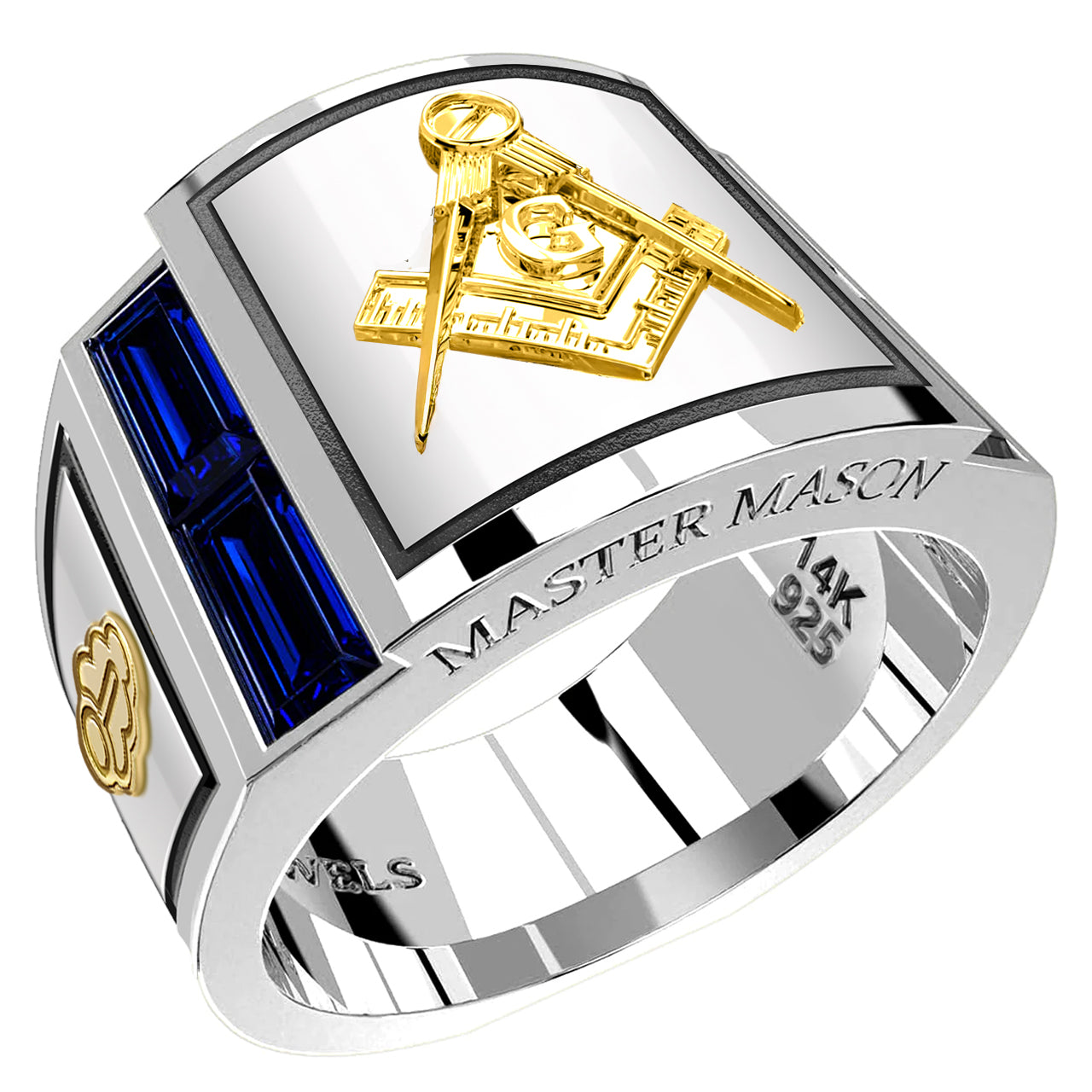 Explore our newest Masonic Master Mason rings collection, designed to captivate with exceptional craftsmanship and detailed artistry. Each ring boasts a solid back, intricate deep-cast designs, and 3D embossed graphics on a flat-bottom band. The standout feature is the striking blue lab-created sapphire baguettes, complemented by an elevated square and compass emblem. Handcrafted with care, these rings are available in 925, 10k, 14k, 18k gold, or platinum and can be customized to match your fraternity and personal style perfectly.