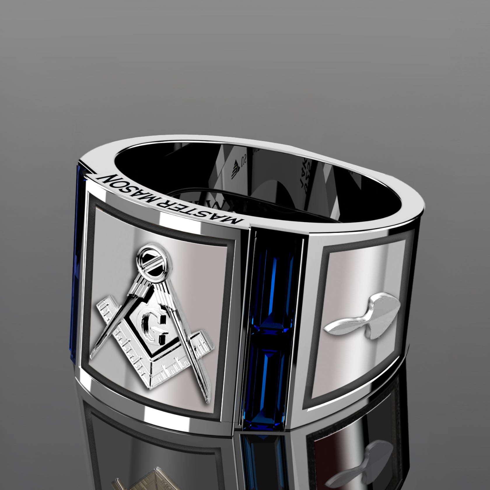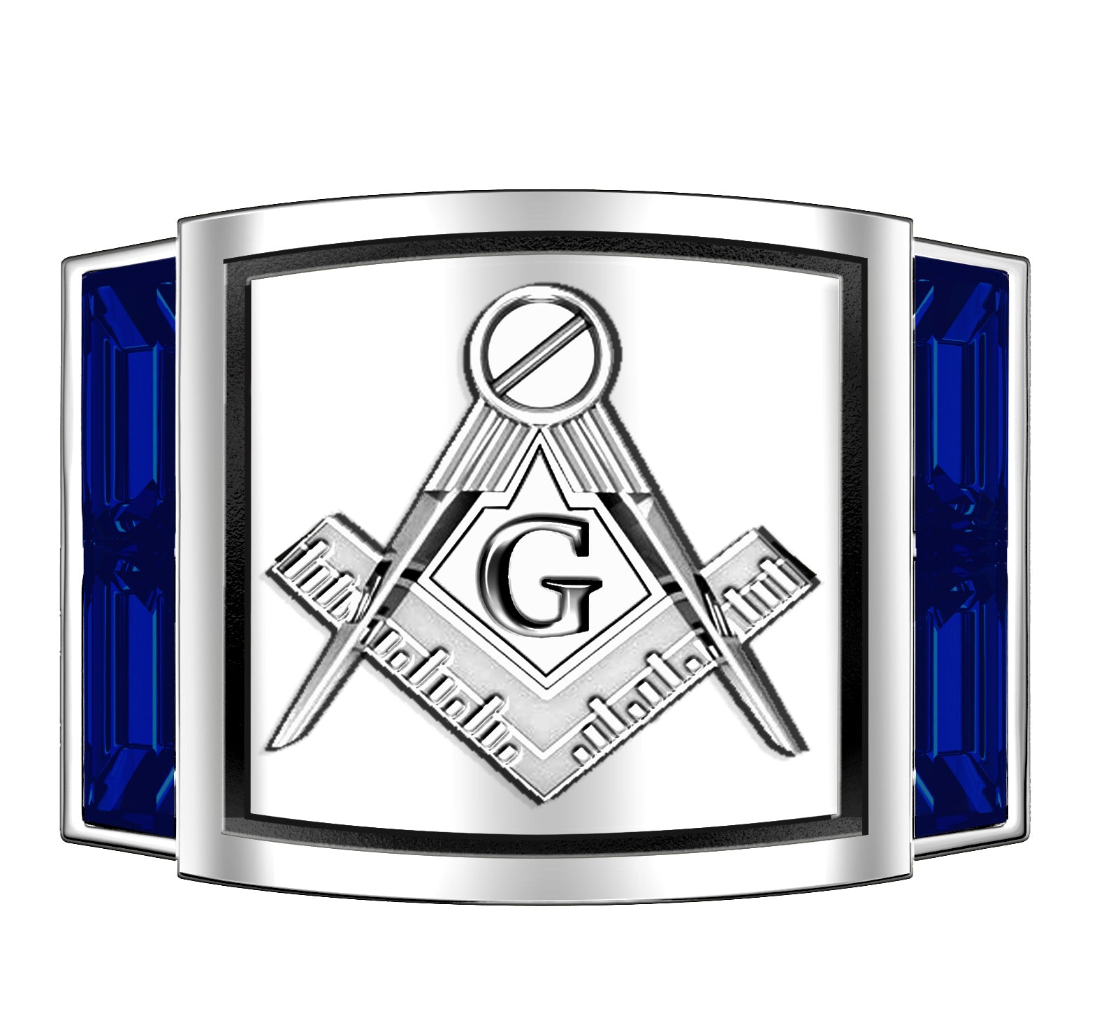 Explore our newest Masonic Master Mason rings collection, designed to captivate with exceptional craftsmanship and detailed artistry. Each ring boasts a solid back, intricate deep-cast designs, and 3D embossed graphics on a flat-bottom band. The standout feature is the striking blue lab-created sapphire baguettes, complemented by an elevated square and compass emblem. Handcrafted with care, these rings are available in 10k, 14k, 18k gold, or platinum and can be customized to match your fraternity and personal style perfectly.