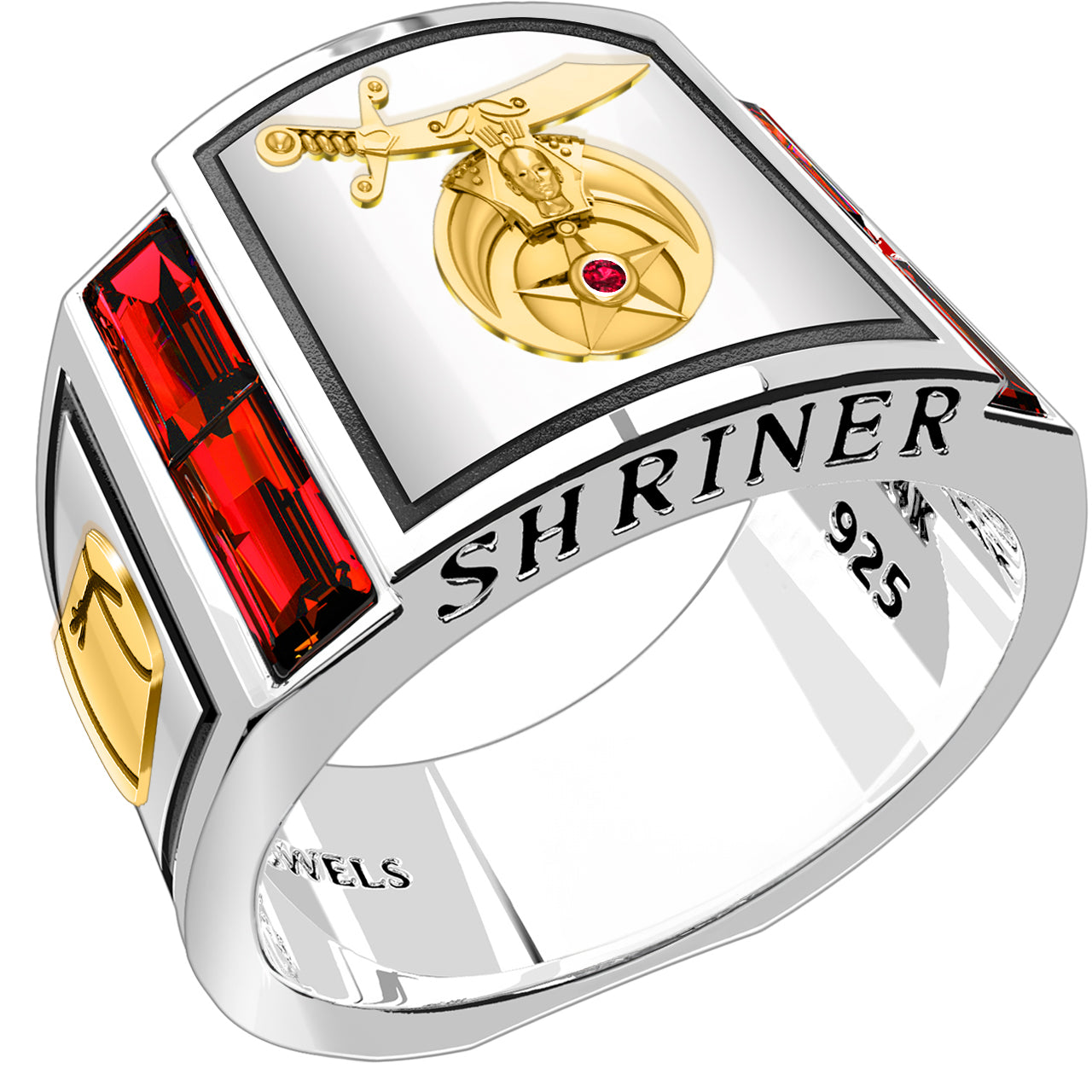 Explore our newest Shriner rings collection, designed to captivate with exceptional craftsmanship and detailed artistry. Each ring boasts a solid back, intricate deep-cast designs, and 3D embossed graphics on a flat-bottom band. The standout feature is the striking red lab-created ruby baguettes, complemented by an elevated mystic Shriner emblem. Handcrafted with care, these rings are available in 925, 10k, 14k, 18k gold, or platinum and can be customized to match your fraternity and personal style perfectly.