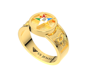 Presenting our latest Eastern Star Past Matron ring. The hallmark of Eastern Star, an inverted five-pointed star, is adorned with a gavel symbolizing the Past Matron's role. Each point of the star is dedicated to a biblical heroine and corresponds to a distinct degree within the Order, embodying unique virtues.