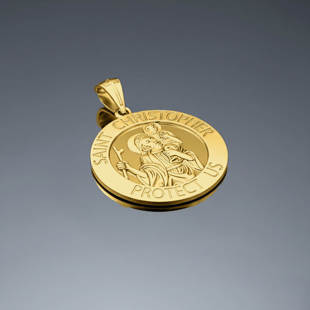 Handcrafted from 14k yellow gold, this pendant features an embossed figurine of Saint Christopher, a round shape, and has deeply casted lettering. All of our new saint medals are designed to last multiple lifetimes. They are solid, heavy and highly detailed. Saint Christopher is the legendary patron saint of travelers, invoked as protection against danger, storms, and plagues.