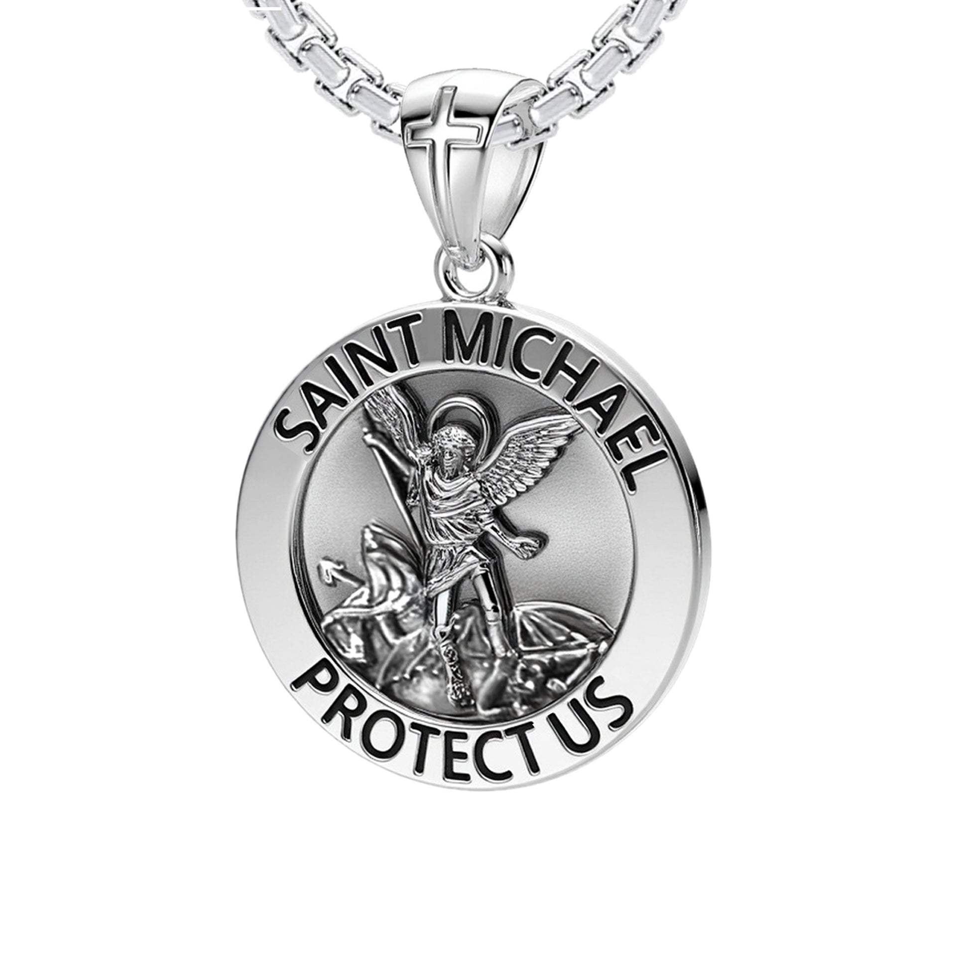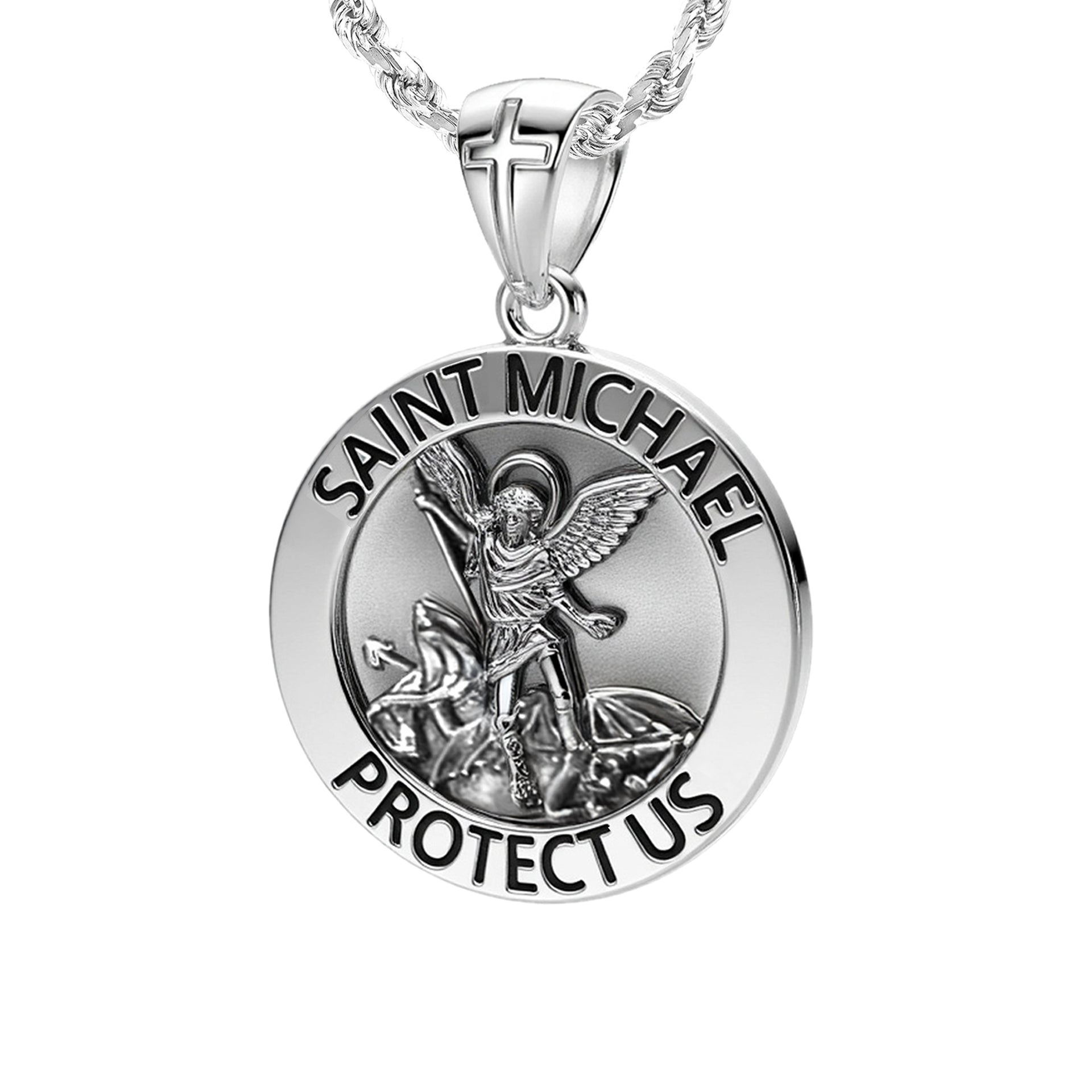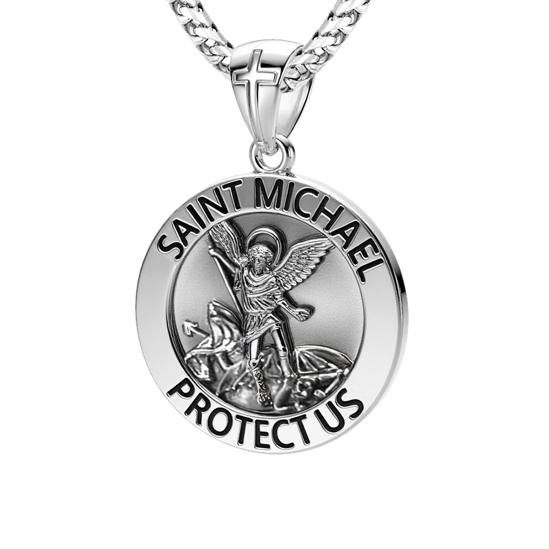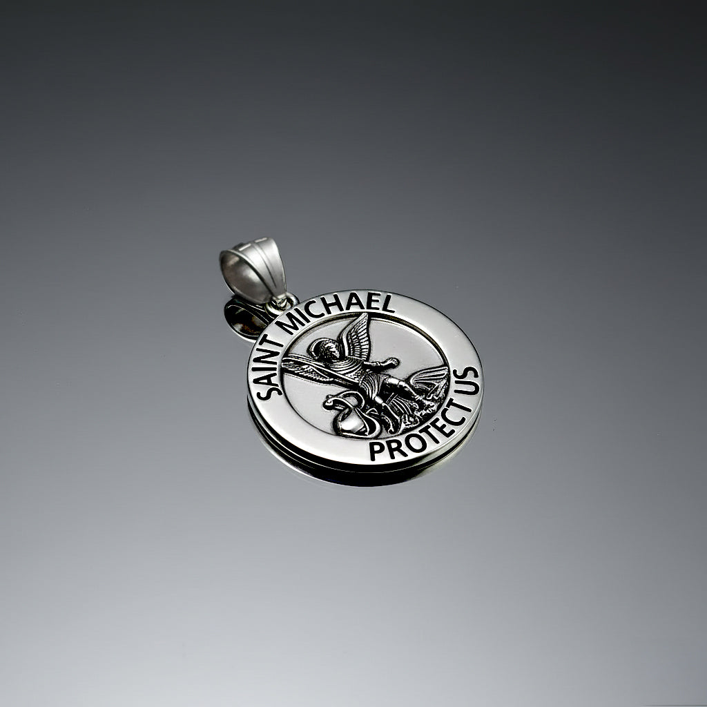 Handcrafted from 925 sterling silver, this saint medal pendant features an embossed figurine of Saint Michael, deeply engraved lettering, solid construction and a semi-antique finish. Saint Michael is the legendary patron saint of the military and police forces. He is a fierce warrior and defender of the children of God.