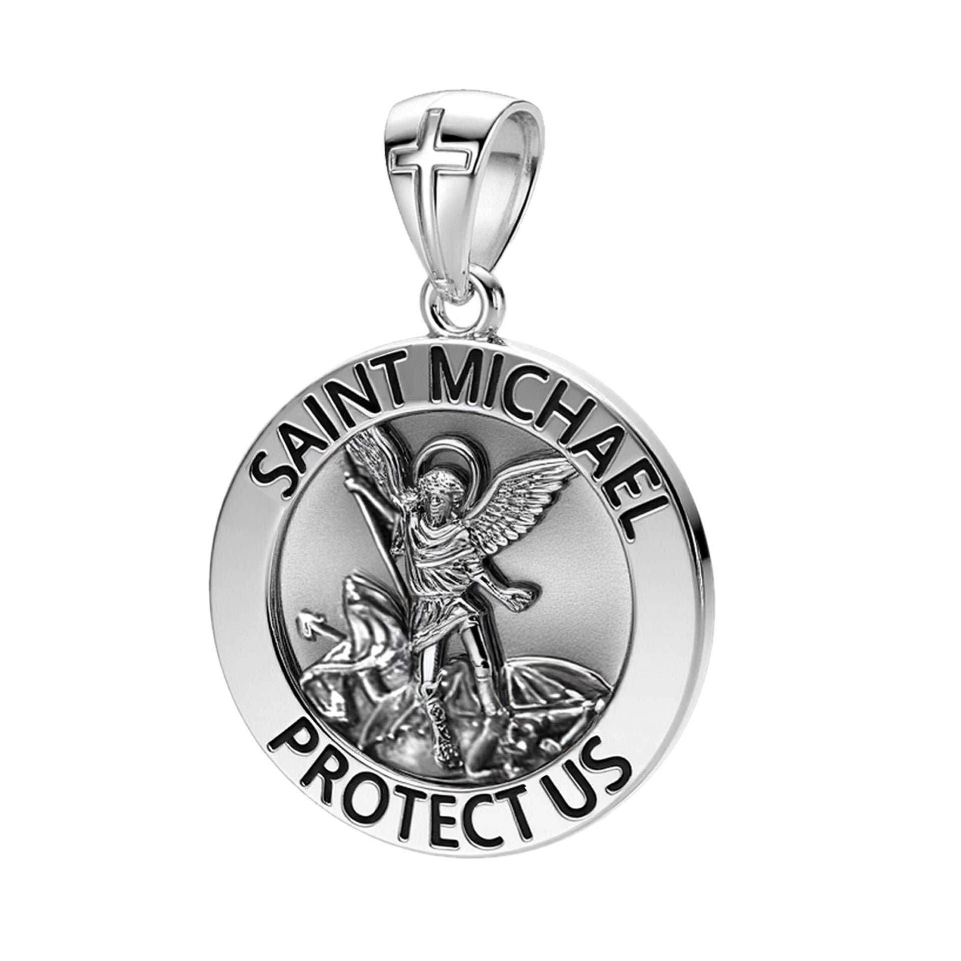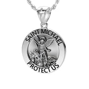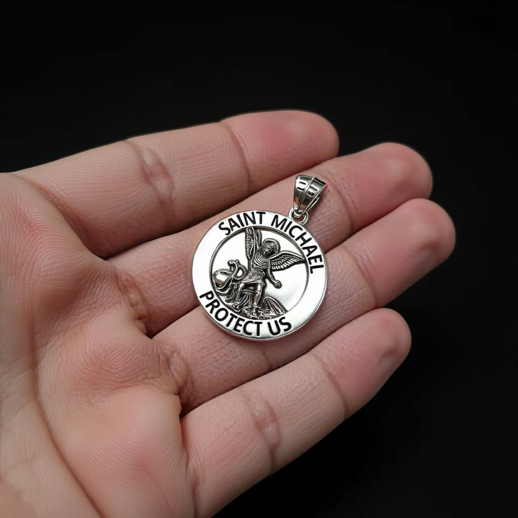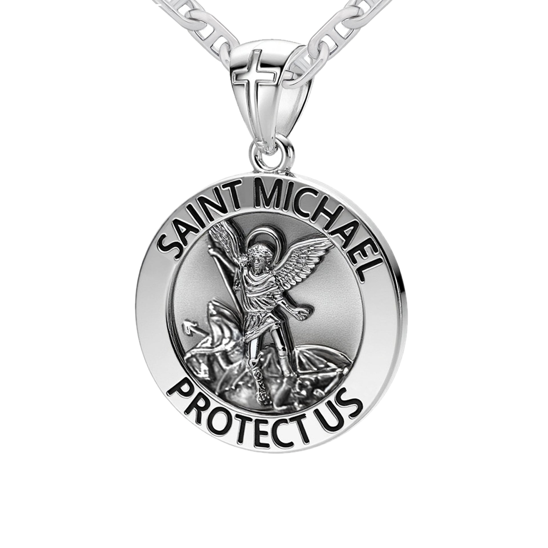 Handcrafted from 925 sterling silver, this saint medal pendant features an embossed figurine of Saint Michael, deeply engraved lettering, solid construction and a semi-antique finish. Saint Michael is the legendary patron saint of the military and police forces. He is a fierce warrior and defender of the children of God.