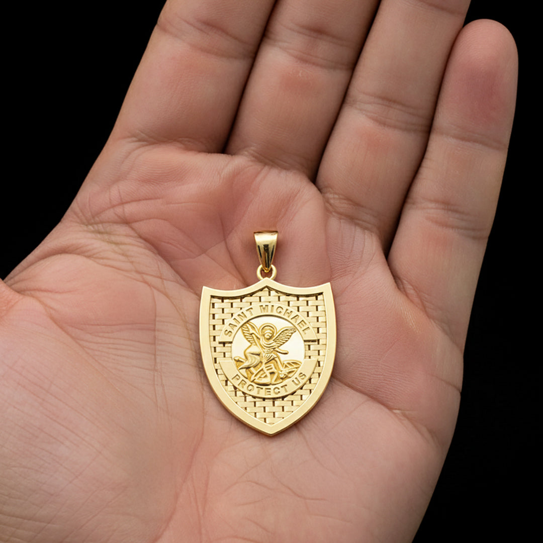 Come try our newly designed 14K yellow gold Saint Michael shield pendant. This pendant features an embossed figurine of St. Michael slaying Satan, a shield or badge shape, and a detailed weave pattern background. All of our new saint medals are designed to last multiple lifetimes. They are solid, heavy & highly detailed. Saint Michael is the legendary patron saint of travelers, invoked as protection against danger, storms, and plagues.