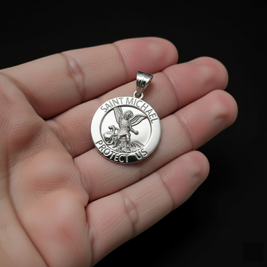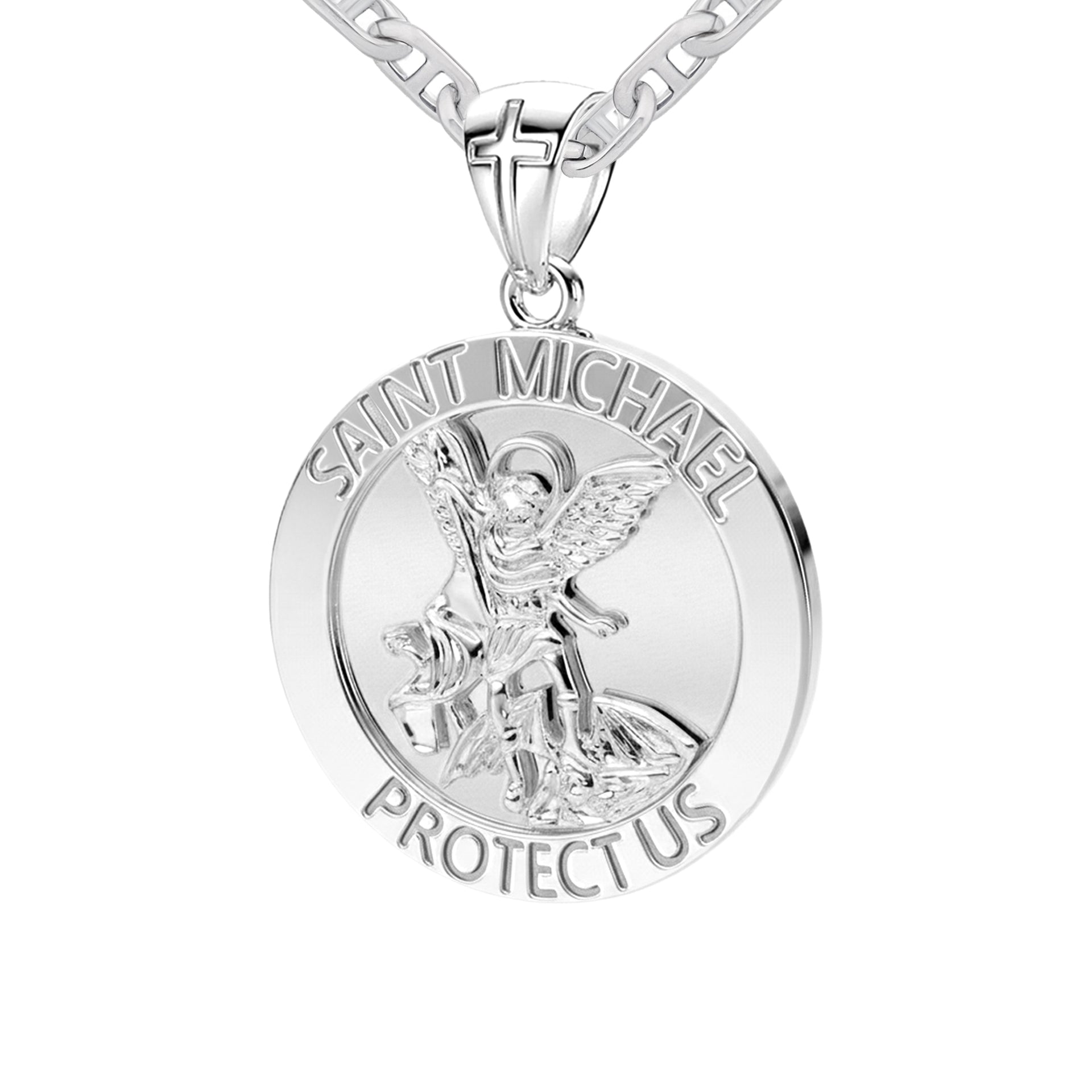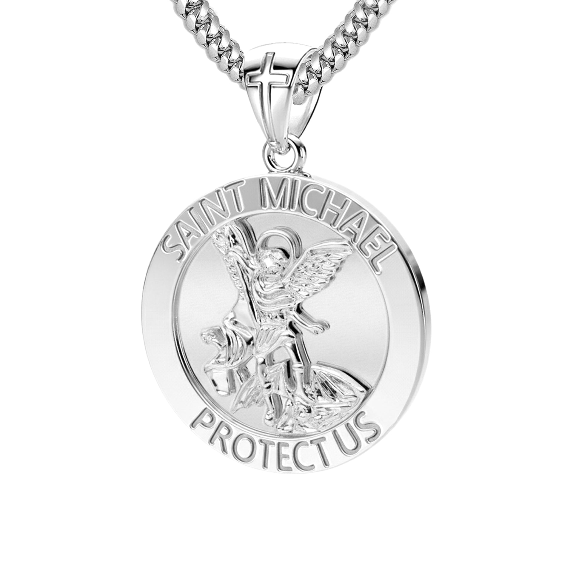 Handcrafted from 925 sterling silver, this saint medal pendant features an embossed figurine of Saint Michael, deeply engraved lettering, solid construction and a polished finish. Saint Michael is the legendary patron saint of the military and police forces. He is a fierce warrior and defender of the children of God.