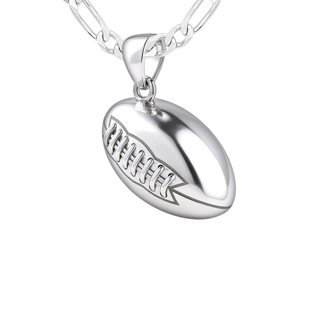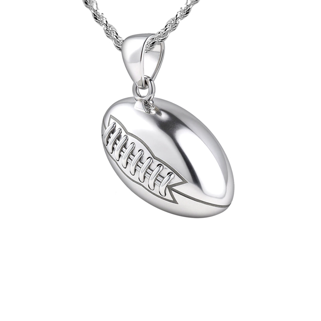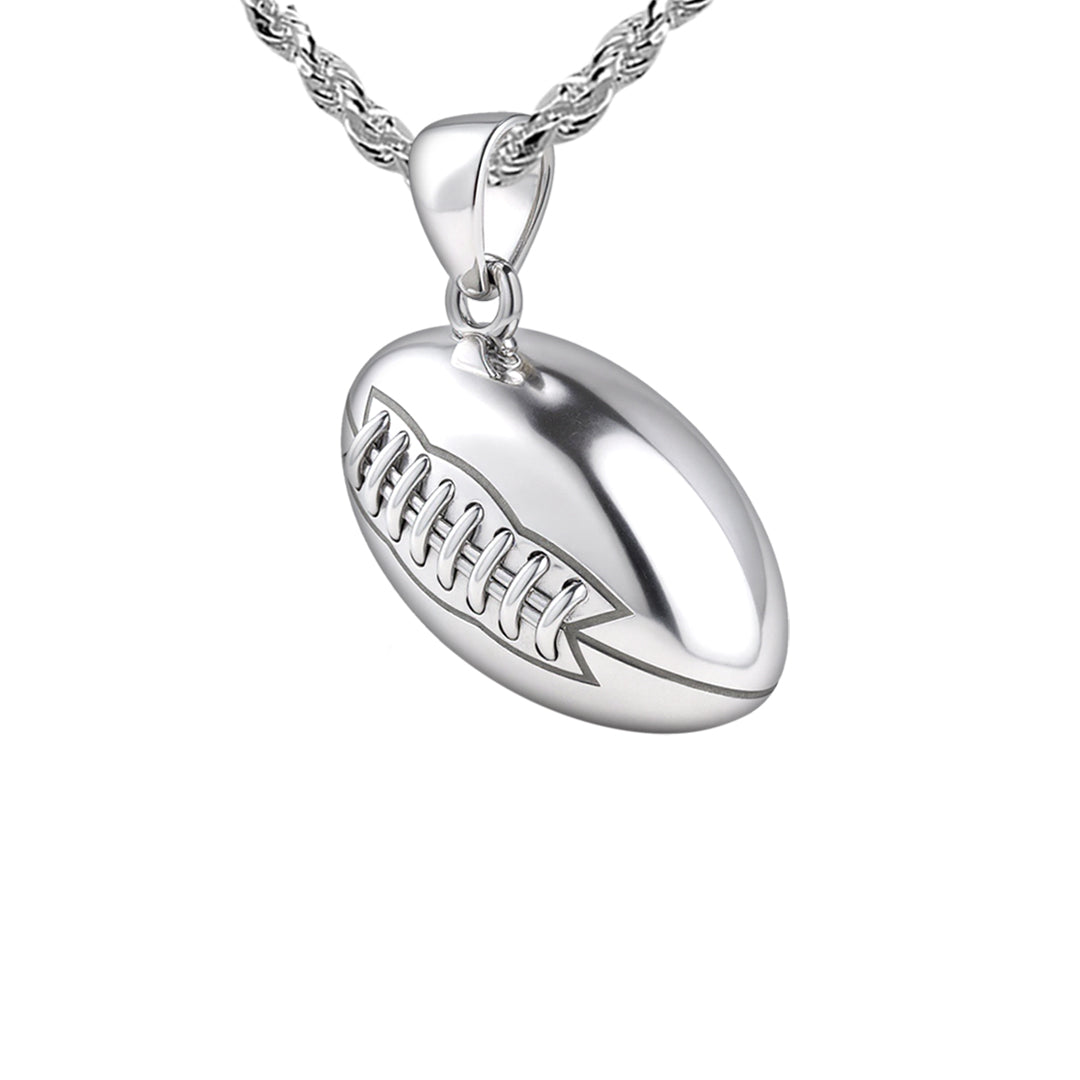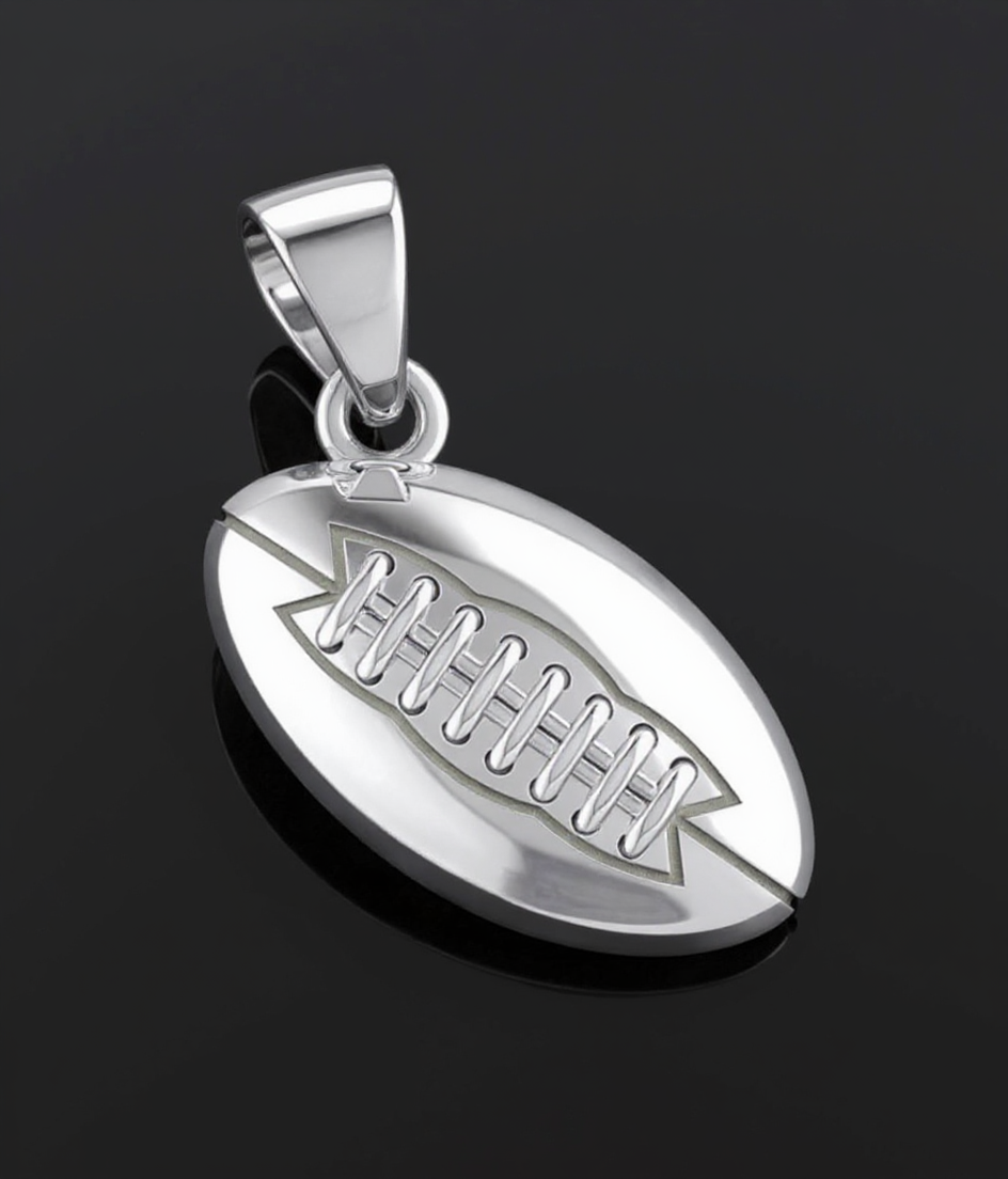 US Jewels solid sterling silver sports pendant was designed to replicate the look and feel of a real football. Nothing currently on the marketplace today matches the quality of our new sports jewelry collection. Whether you are a player or simply an avid sports fan, you will appreciate the realist look and solid 3d ovoidal-shaped football pendant.