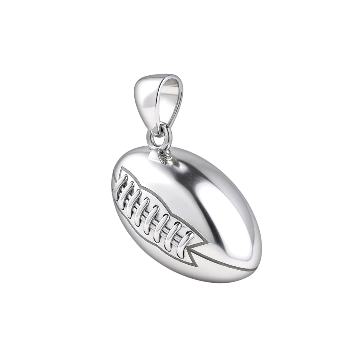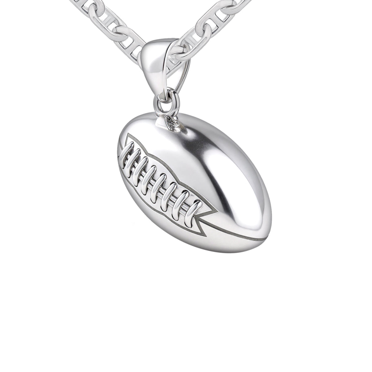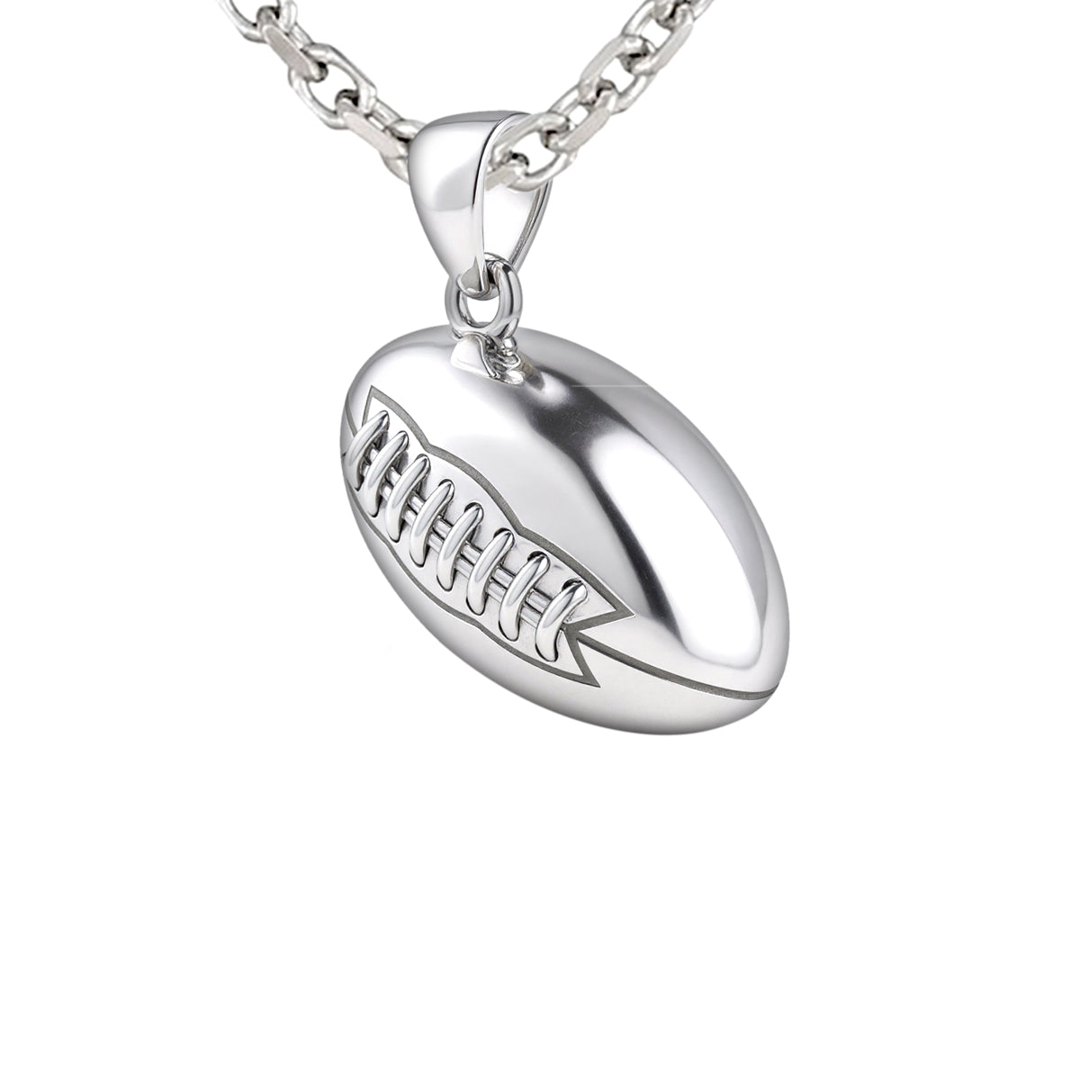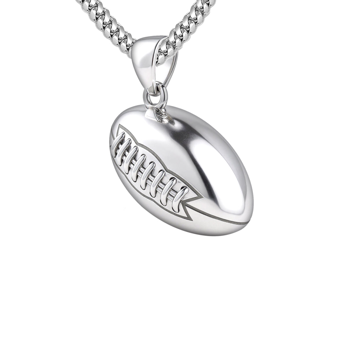 US Jewels solid sterling silver sports pendant was designed to replicate the look and feel of a real football. Nothing currently on the marketplace today matches the quality of our new sports jewelry collection. Whether you are a player or simply an avid sports fan, you will appreciate the realist look and solid 3d ovoidal-shaped football pendant.