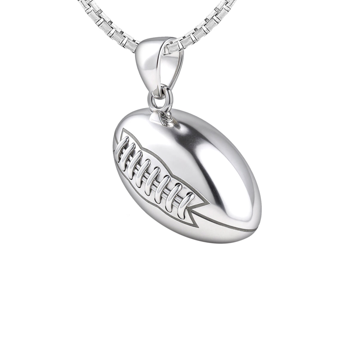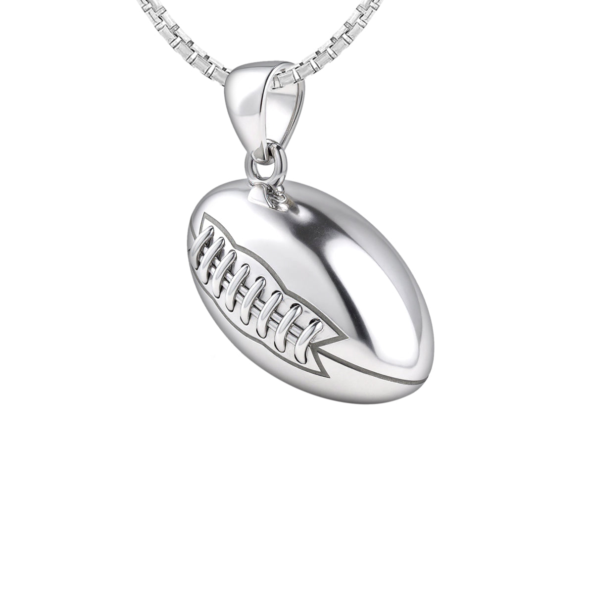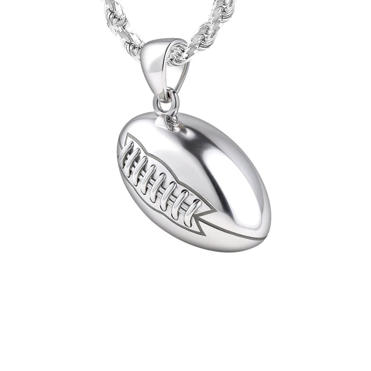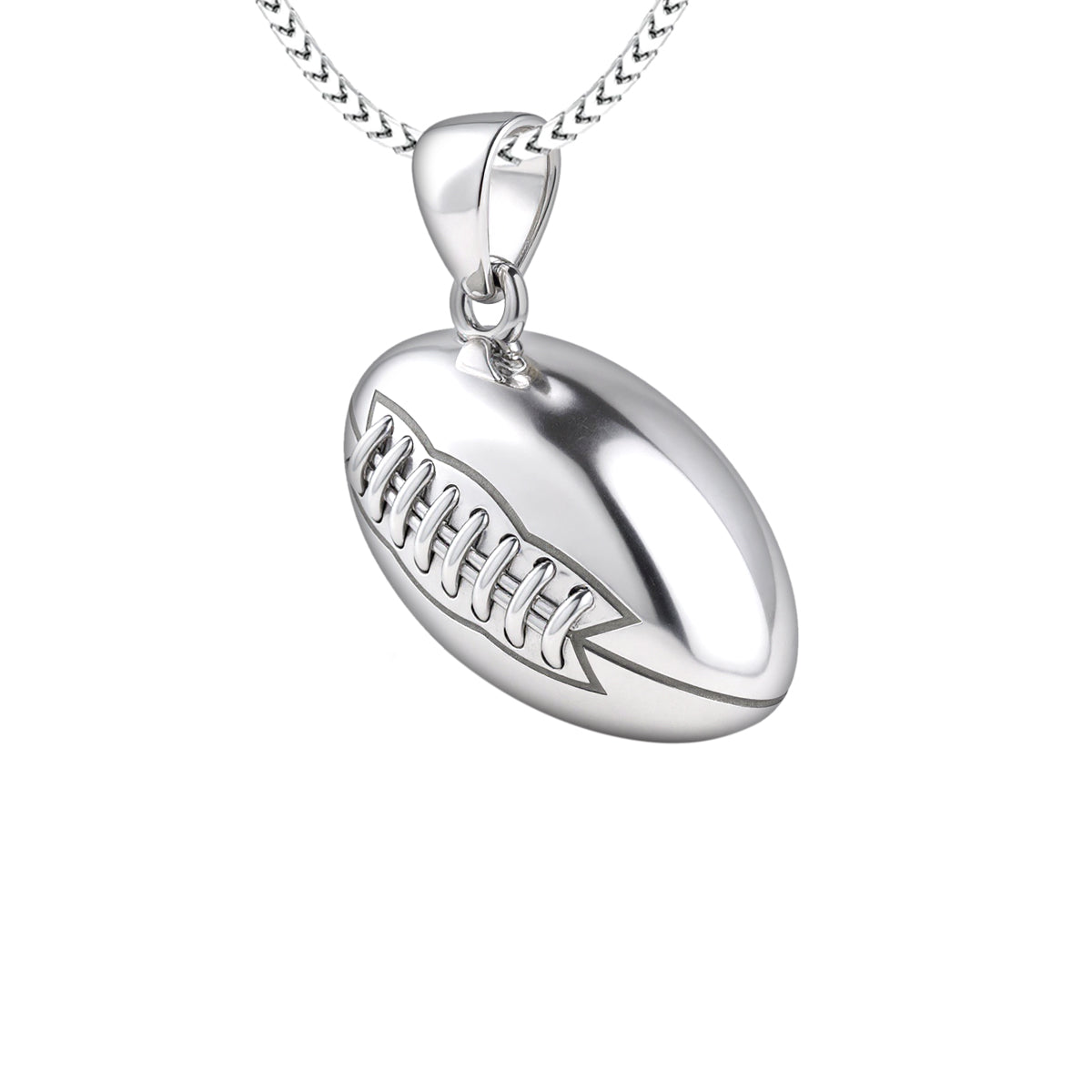 US Jewels solid sterling silver sports pendant was designed to replicate the look and feel of a real football. Nothing currently on the marketplace today matches the quality of our new sports jewelry collection. Whether you are a player or simply an avid sports fan, you will appreciate the realist look and solid 3d ovoidal-shaped football pendant.