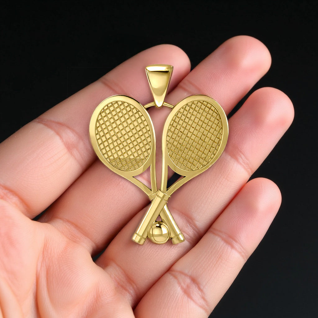 A women's small realistic double tennis racket and ball pendant is crafted from solid 10k yellow or white gold. Measuring 25mm tall (excluding the bail), this sports pendant was designed to replicate the look and feel of a real tennis racket. Whether you are a player or simply an avid sports fan, you will appreciate the realistic look of this sports pendant.