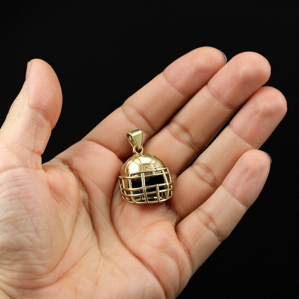 A realistic men's 3D football helmet pendant is crafted from solid 14k yellow or white gold. Measuring 22mm x 19mm x 19mm (excluding the bail), this sports pendant was designed to replicate the look and feel of a real football helmet. Whether you are a player or simply an avid sports fan, you will appreciate the realistic look of this sports pendant.