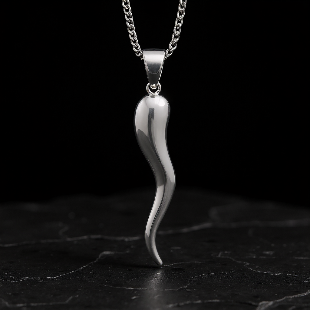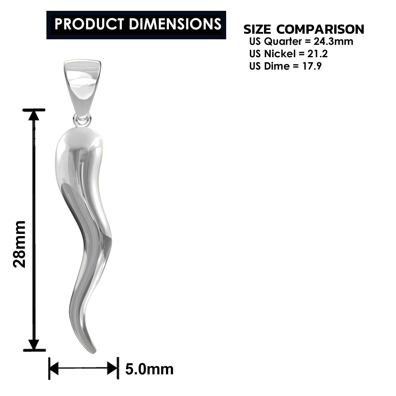 Men's 925 Sterling Silver Italian Horn Cornicello Amulet Pendant Necklace, 28mm