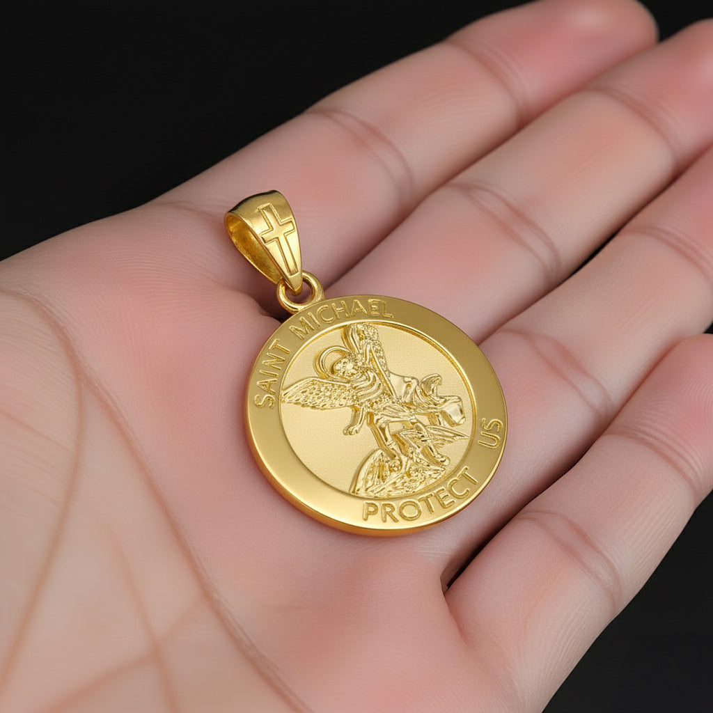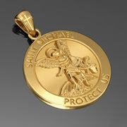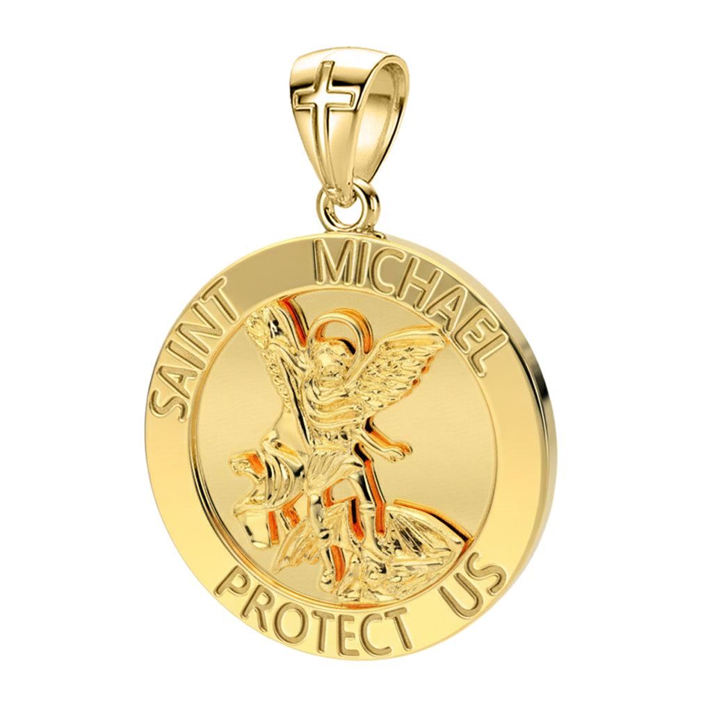 Come try our newly designed 14k yellow gold Saint Michael pendant. This pendant features an embossed figurine of St. Michael slaying Satan, a round shape, and a deeply casted lettering. All of our new saint medals are designed to last multiple lifetimes. They are solid, heavy and highly detailed. Saint Michael is the legendary patron saint of travelers, invoked as protection against danger, storms, and plagues.