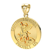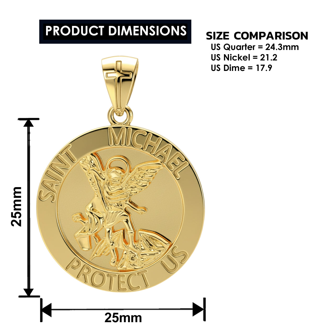 Solid 14K Yellow Gold St Saint Michael Medal Round Pendant Necklace, 25mm