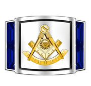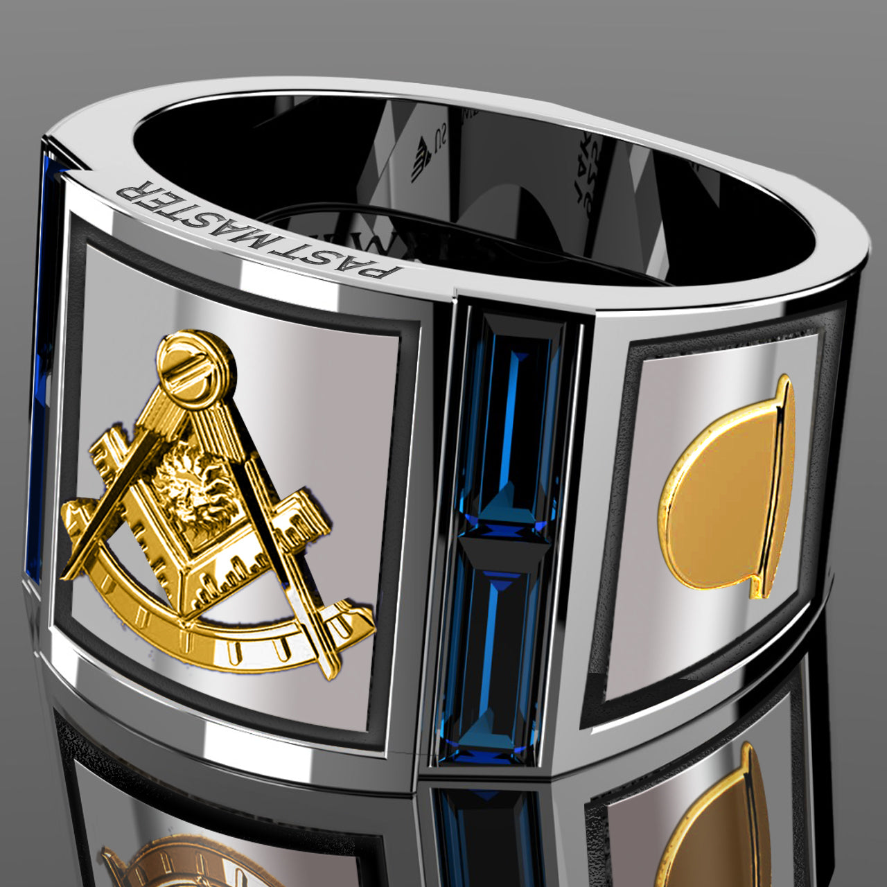 Crafted with exceptional quality and attention to detail, these rings feature a solid back, deep-cast designs, and 3D embossed graphics on a flat-bottom band. The centerpiece of each ring is an emblem that combines the square, compass, sun and quadrant, signifying the Past Master. Each ring is adorned with a gavel on one side and a top hat on the other, further highlighting the symbols of Masonic leadership. Enhanced with striking blue lab-created sapphire baguettes, these rings exude sophistication and distinction.