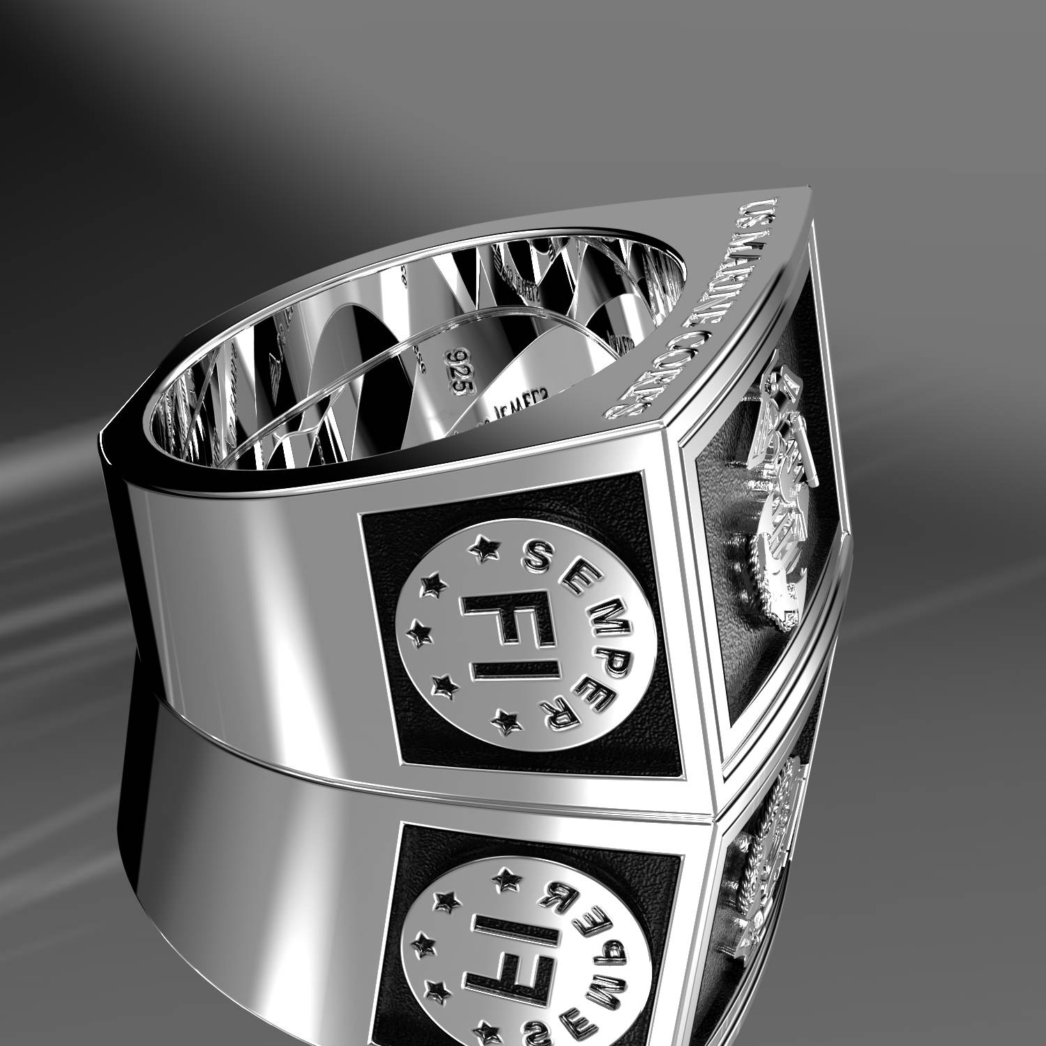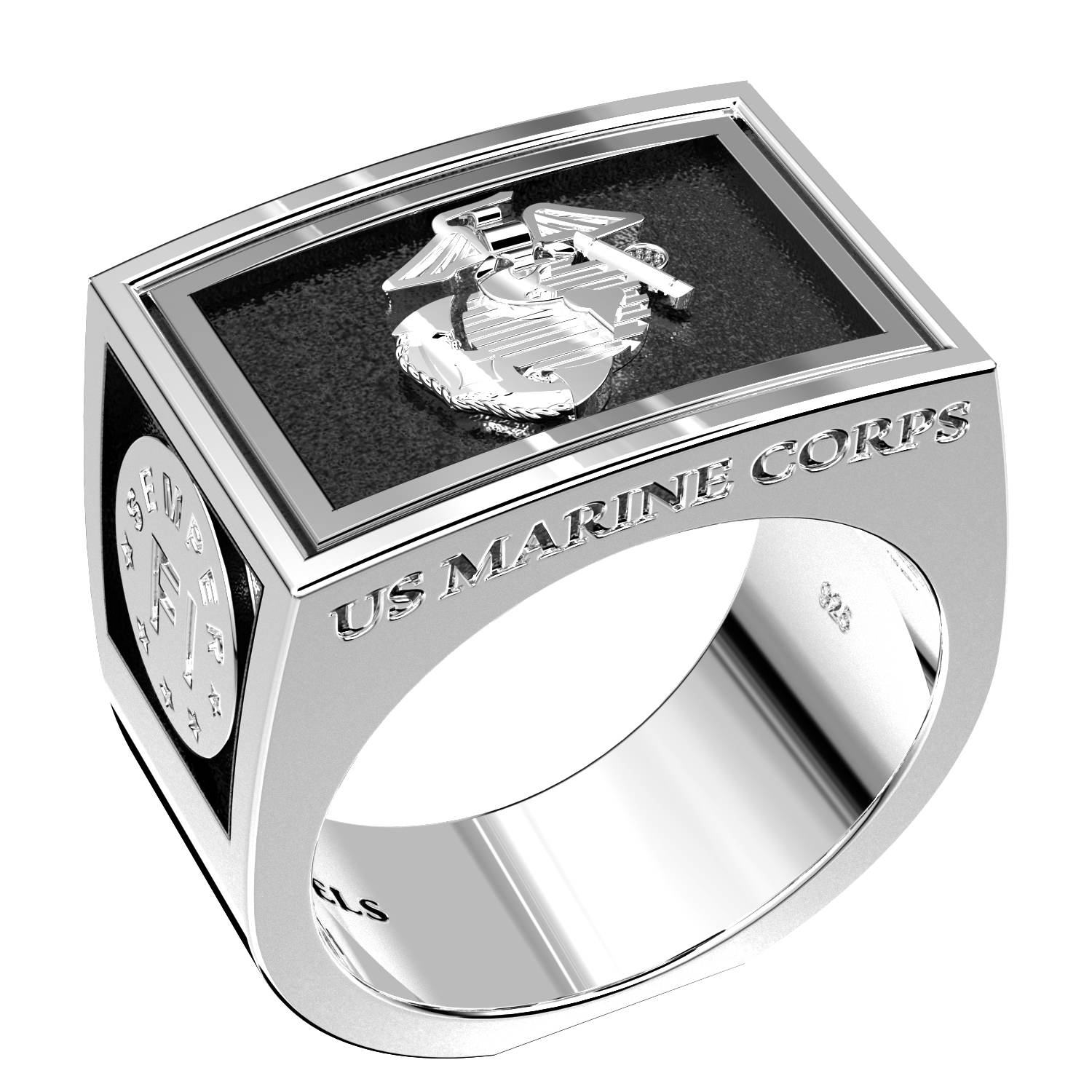 The Solid 925 Sterling Silver Marine Corps Ring is an impressive piece of jewelry designed to honor those who serve or have served in the United States Marine Corps. This beautifully crafted ring features embossed emblems and is made from heavy solid 925 sterling silver with a 16mm top width and an 8 mm bottom width. It's sure to last through rough use and be a lasting reminder of your pride. Every ring is hallmarked 925, 10k or 14k and 5% of all sales go directly to our military.