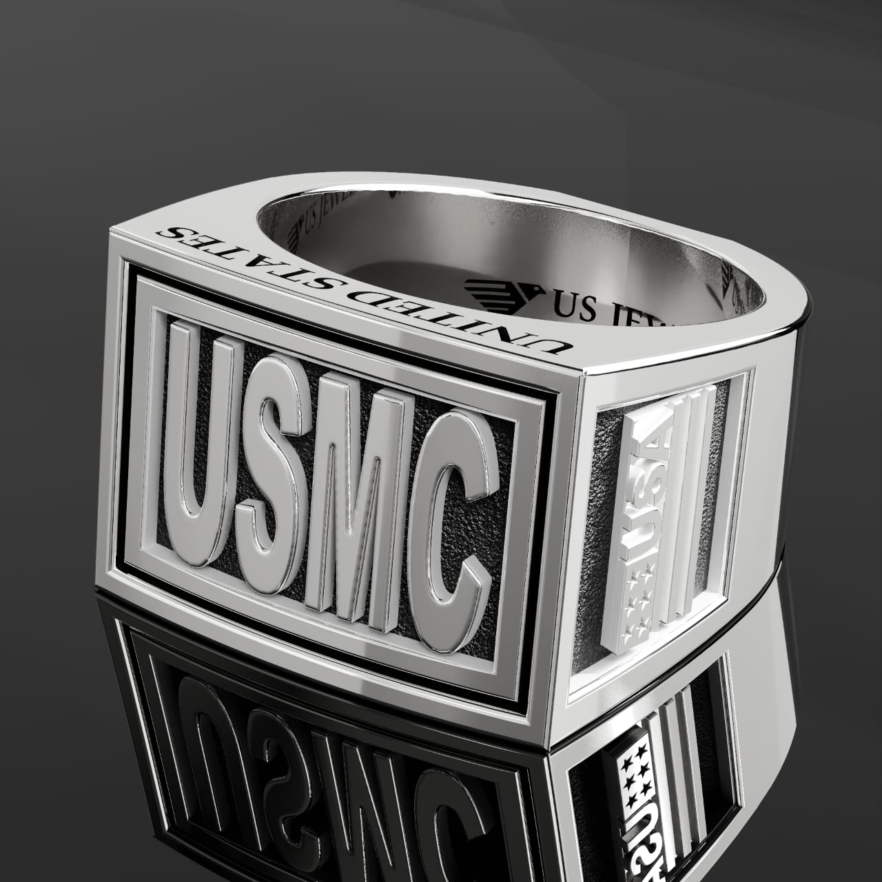The Solid 925 Sterling Silver Marine Corps Ring is a timeless piece of jewelry that honors the service and sacrifice of all those who serve in the US Marines. This ring features solid back design, deep casted details, 3D embossed graphics, and a flat bottom making it extremely comfortable to wear. It is officially licensed by the USMC for authenticity. Every ring is hallmarked 925, 10k or 14k and 5% of all sales go directly to our military.