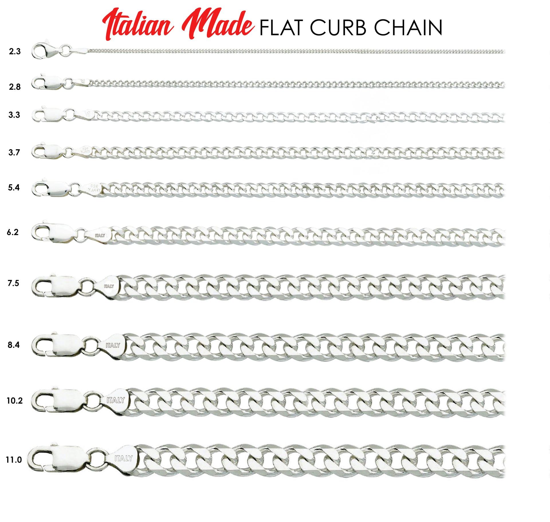 Add a little bling to your wardrobe with this 925 sterling silver stylish Curb chain necklace. Our trademarked Curb chains are solid and come with a lifetime warranty. They are available in sizes 2.3mm thru 11mm and lengths 16in thru 30in. Each chain fastens with a strong lobster claw clasp and is made with the highest quality sterling silver alloy. It makes a perfect gift that will never fade or tarnish.